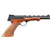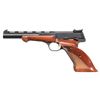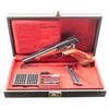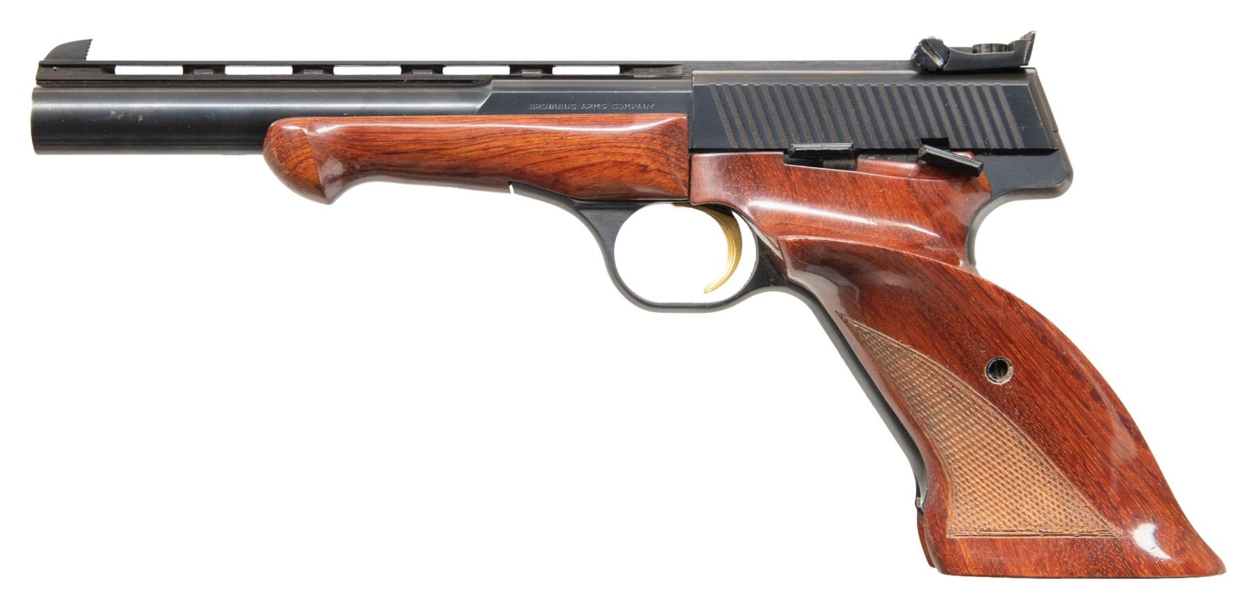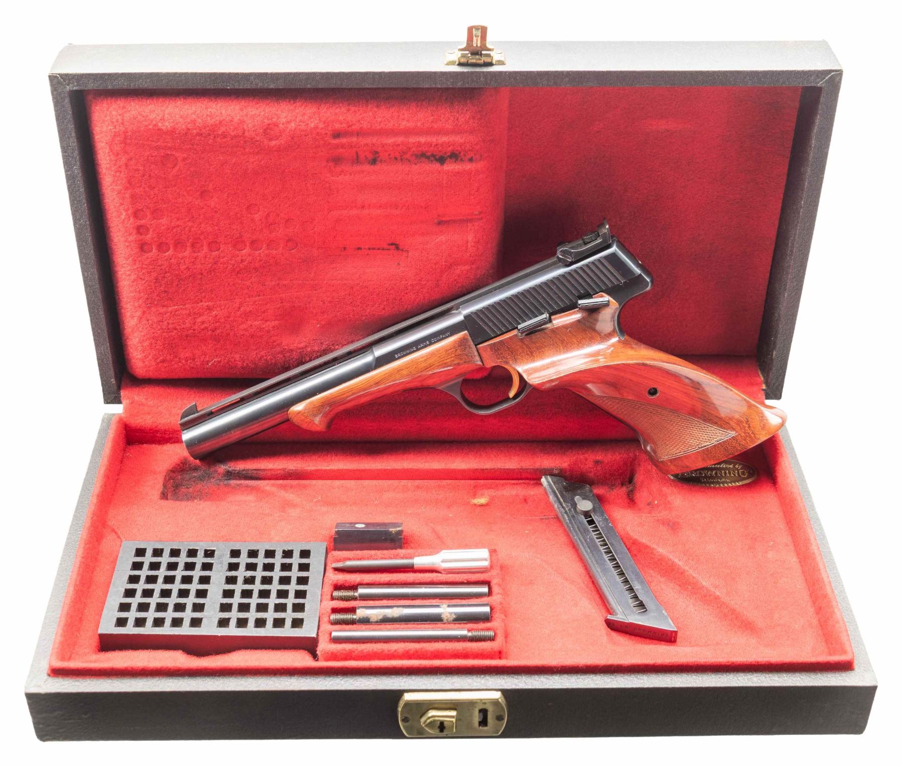 WITH CASE & ACCESSORIES. Cal. 22 LR. S# 31862T3. Bbl. 6 3/4". Medalist semi-automatic pistol mfg. in Belgium and imported by Browning in 1963. Left side of the bbl. is marked "BROWNING ARMS COMPANY", with "MADE IN BELGIUM 22 L.R." marked on the right. Underside of bbl. and front face of slide exhibit Belgian proofs. Metal components exhibit a blue finish overall, save for on the trigger, which exhibits a gold plated finish. 2-piece checkered wood thumbrest grips with plain wood schnabel tip forend. V/R with pinned blade front sight and adj. square notch rear sight. MAGS: 2 10-rd. UNATTACHED ACCESSORIES: black leatherette wrapped Browning case featuring a red fabric interior, containing a black synthetic 60-rd. cartridge block, 4 assorted weights, screwdriver, as well as factory paperwork. CONDITION: metal components retain the majority of their original factory blue finish, exhibiting a few scattered spots of light to mild wear and thinning that are fading to gray patina. Mirror bore, retaining well defined rifling throughout. Proper manual mechanics. Wood furniture shows scattered superficial marks and small impressions, but otherwise remains sound. Exterior of case shows scattered marks from handling and storage, with some losses to the leatherette lining on corners. Interior shows some staining. 1 weight shows a couple areas of mild surface oxidation. (25-6098/MLW). CURIO. $700-1,000.