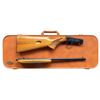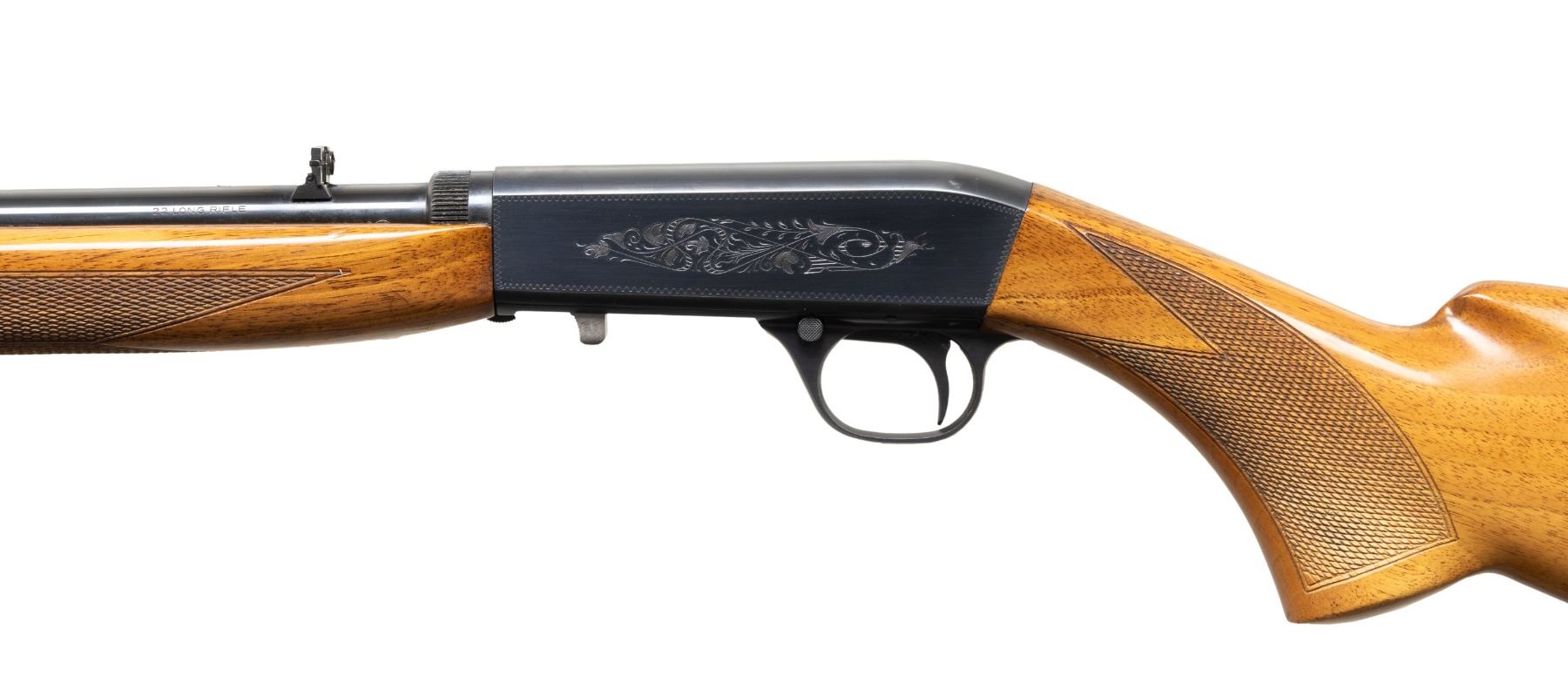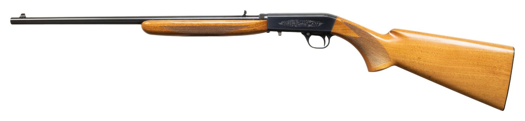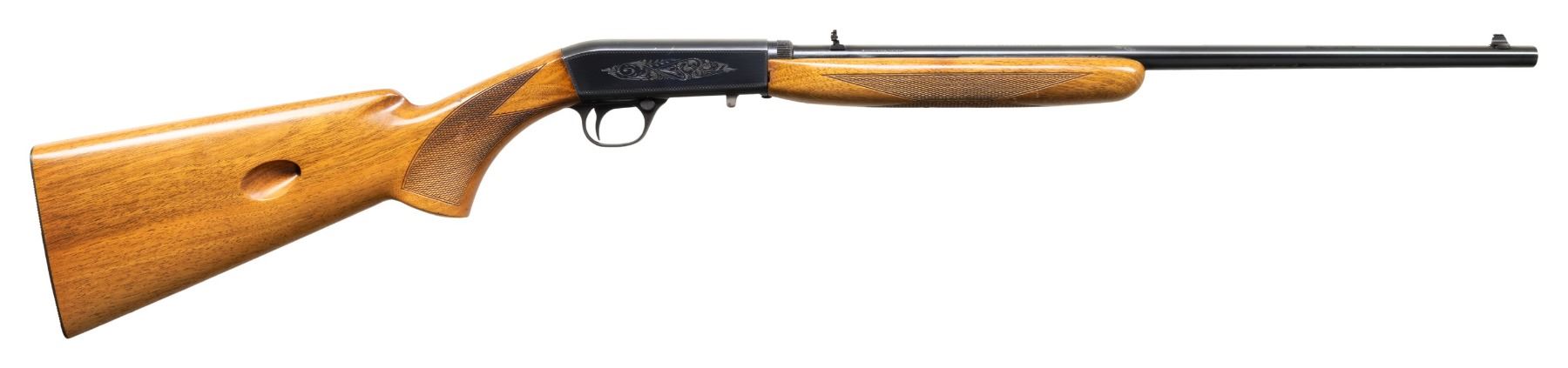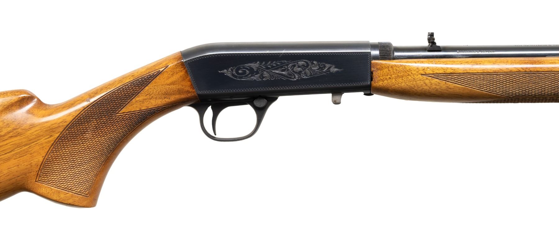 FACTORY CASE. Cal. 22 LR. S# 7T63332. Bbl. 19 3/8". SA-22 semi-automatic rifle mfg. in Belgium by Fabrique Nationale and imported/retailed by Browning Arms Company in 1967. Top of the rnd. bbl. is marked with Browning's importer information above "MADE IN BELGIUM", with the S# marked on the underside, and the cal. designation marked on the left towards the breech. Sides of the receiver feature foliate scroll engraving, surmounted by wavy line borders. Underside of trigger guard exhibits a foliate scroll motif. Underside of bolt and left side of bbl. (below wood line) exhibit Belgian commercial proofing. Metal components exhibit a blue finish overall, save for on the bolt, which is polished in-the-white. Checkered wood forearm and pistol grip stock with grooved steel buttplate. Dovetailed brass beaded blade front sight with dovetailed flip-up U-notch rear sight. Top of the bbl. and factory drilled and tapped with 2 plug screws for a scope attachment. UNATTACHED ACCESSORIES: brown leather wrapped browning hard case. CONDITION: metal components retain the majority of their original factory blue finish, exhibiting some superficial handling marks, as well as some spots of light wear. Bbl. shows scattered spots / small patches of light oxidative finish loss and pitting. Mirror bore, exhibiting a couple of small spots of light pitting towards the muzzle, while retaining well defined rifling throughout. Proper manual mechanics. Wood furniture shows some superficial marks and impressions from handling and storage, but otherwise remains sound. Case is very good overall. (25-4771/MLW). CURIO. $300-500.