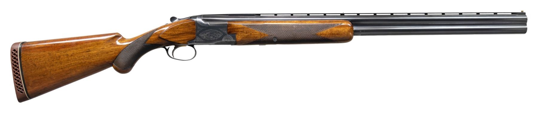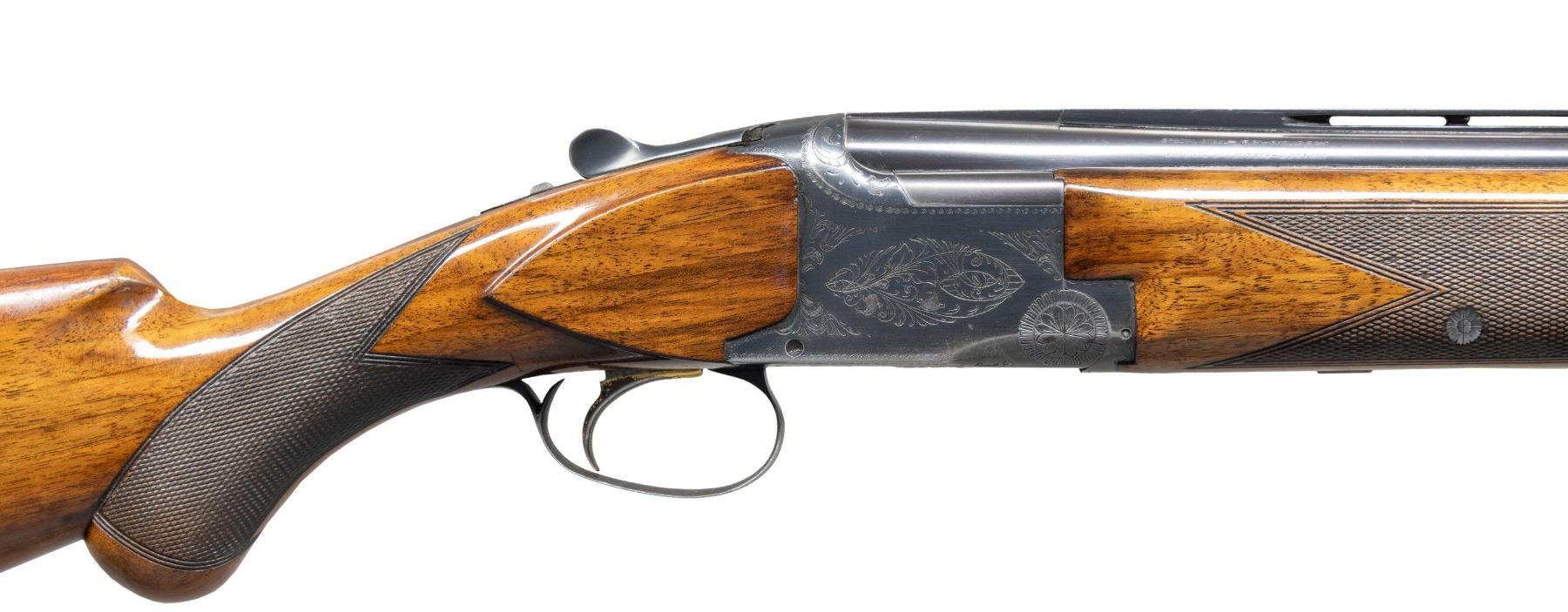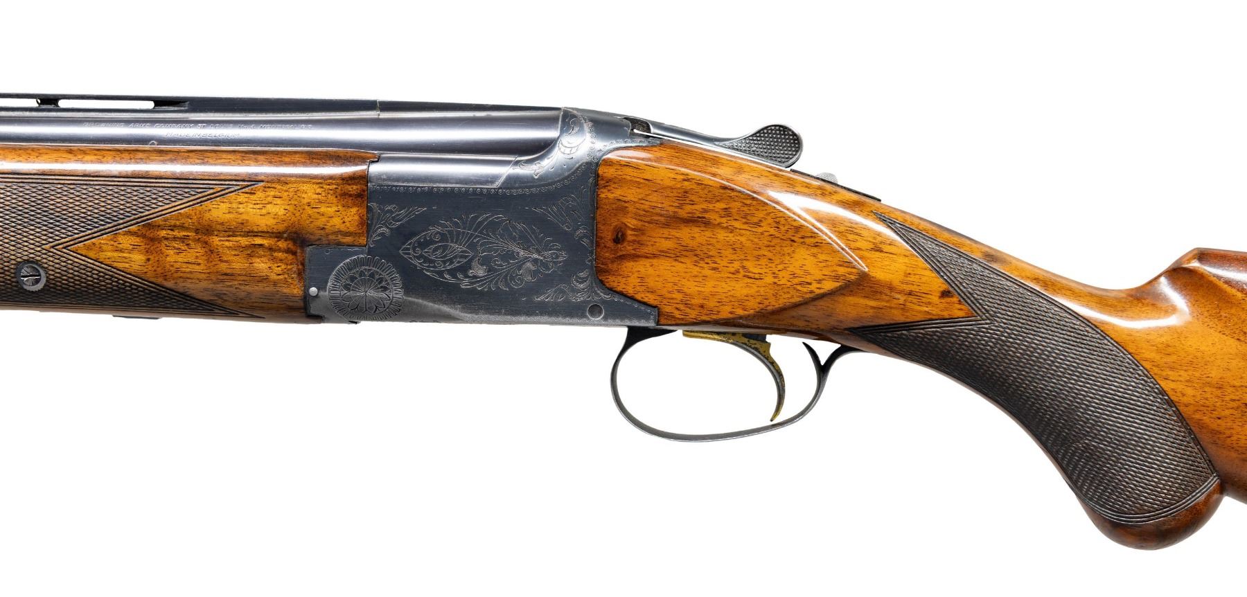 O/U SHOTGUN. Cal. 12 Ga., 2 3/4". S# 63047S6. Mfg. 1966. Matching numbered VR 26.5" w/ brass beads & fixed Skeet chokes. Blued boxlock action w/ Grade I engraving w/ gold washed SST & ejectors. Checkered walnut stock set w/ matching numbered iron & round knob pistol grip. LOP: 14.25" to Pachmayr pad. CONDITION: Good blue with silvering on bottom edges of receiver, top rib shows split & light detachment 2.25" from breech. Fair peeling gold finish. Good wood finish with marks, worn areas of finish & worn spots of checkering. Shiny bores. (25-5198/MD). CURIO. $900-1,500.