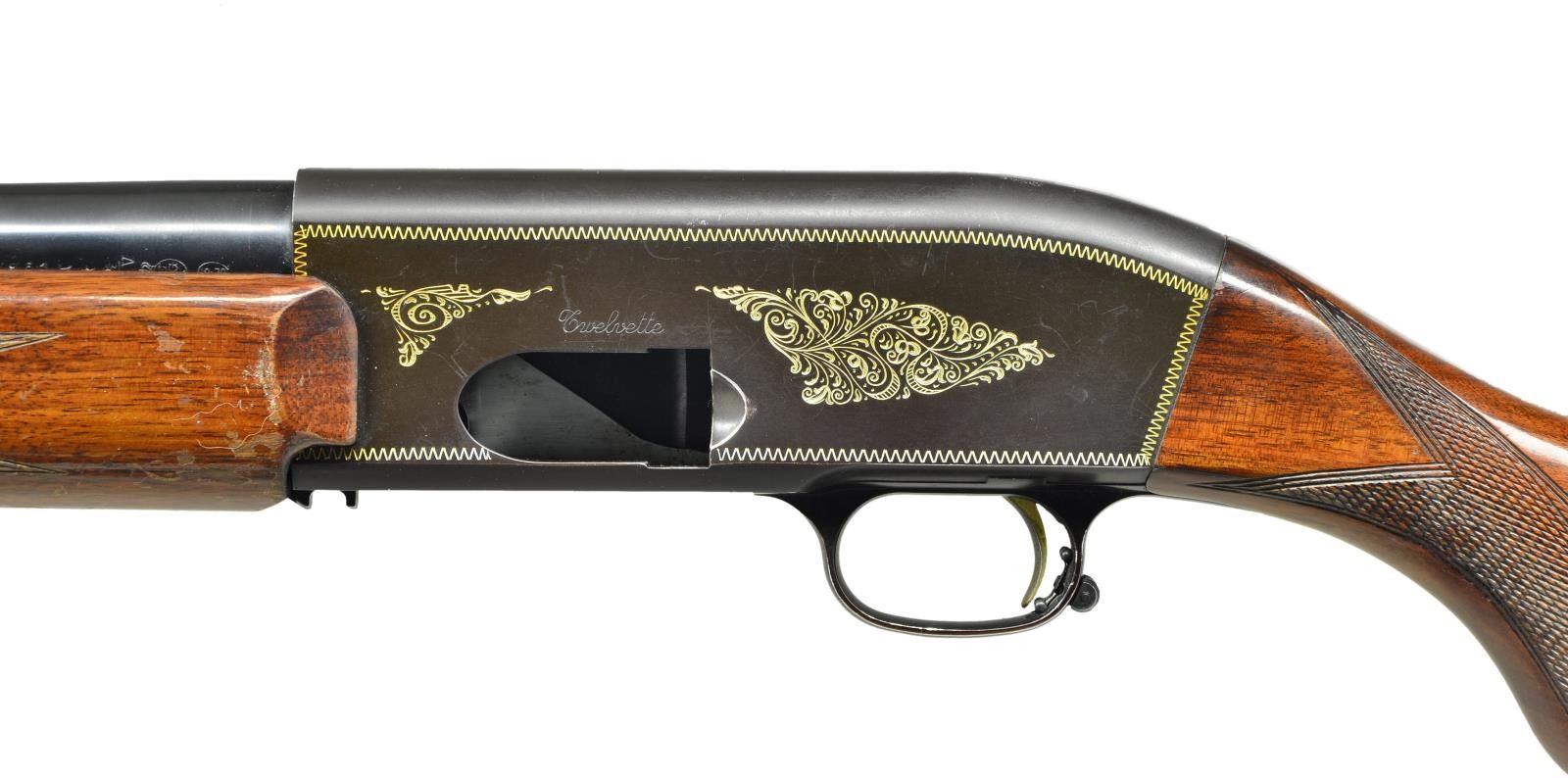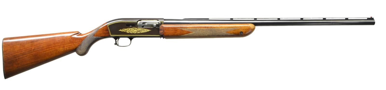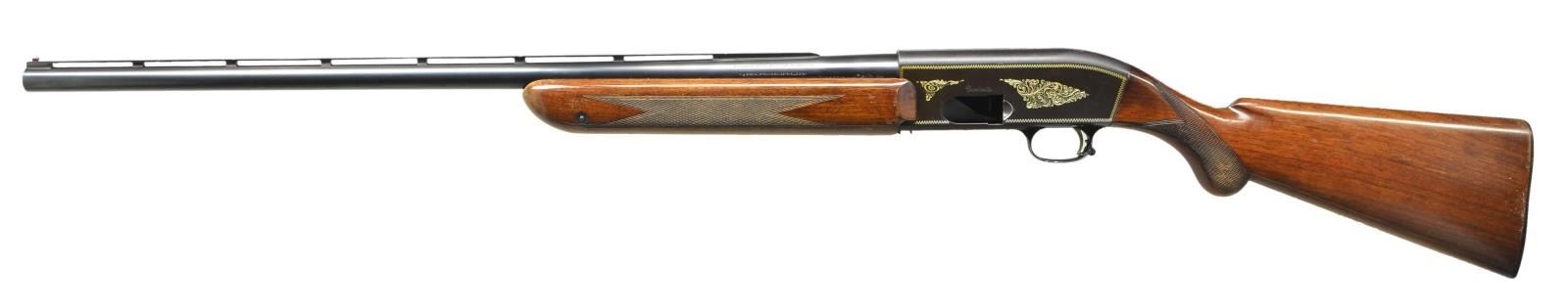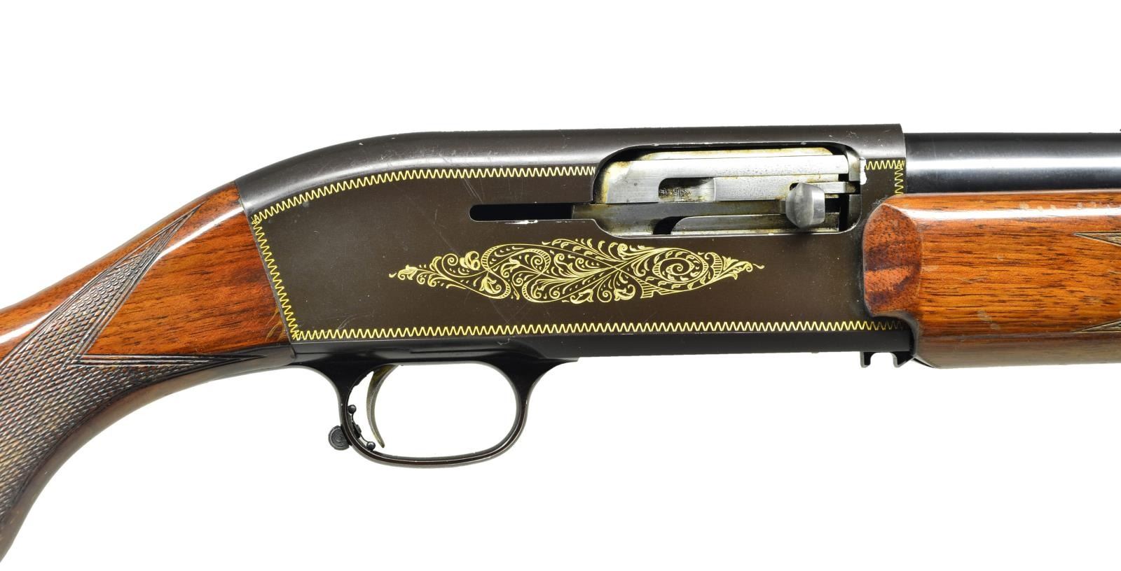 Cal. 12 Ga., 2 3/4". S# A26315 (1955-1958). VR 27 1/2" bbl. w/ red bead front & steel mid bead. Fixed Mod choke (marked *). Alloy short recoil action w/ gold finished zig-zag borders, scroll engraving & triggers. Walnut forearm & rnd. knob stock. LOP: 14 1/2" to Browning Double Auto buttplate. CONDITION: Very good blue w/ pinprick oxidation & a few light marks; vent rib shows small areas of marks. Good receiver blue having a brown tone showing scratches & abrasions on right side of receiver forward of ejection port. Good added varnish on wood showing wear at forearm tip, gouges in wrist checkering, along w/ peeling finish & handling marks throughout. Good shiny bore. (23-200/MD). CURIO. $500-650.