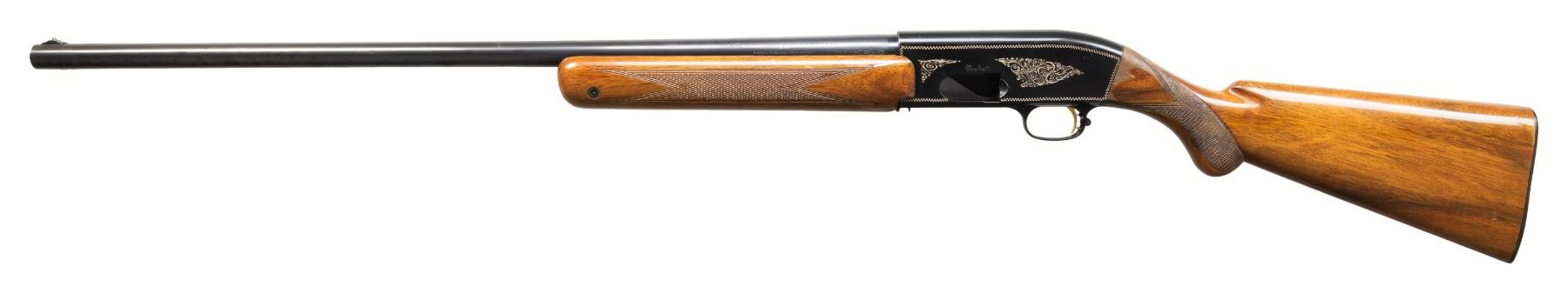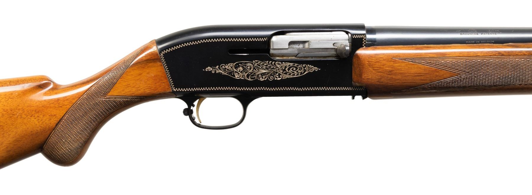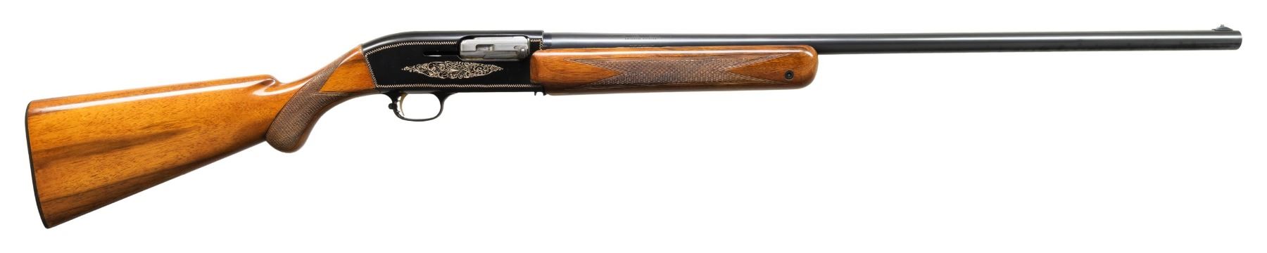 Cal. 12 Ga., 2 3/4". S# 1A40929 (1961). Bbl. 27.5" w/ steel bead & Full choke. Black anodized aluminum receiver w/ gold filled engraving. Checkered walnut stock set w/ Browning buttplate. CONDITION: very good blue & black metal finish with light light handling & scattered small areas of pinprick finish loss on barrel. Good wood finish with peeling finish areas of peeling finish along with 1 noticeable chip on forearm right side barrel channel. Shiny bore with light fouling. PROVENANCE: Estate of Lloyd Robinson. (25-6655/MD). CURIO. $400-600.