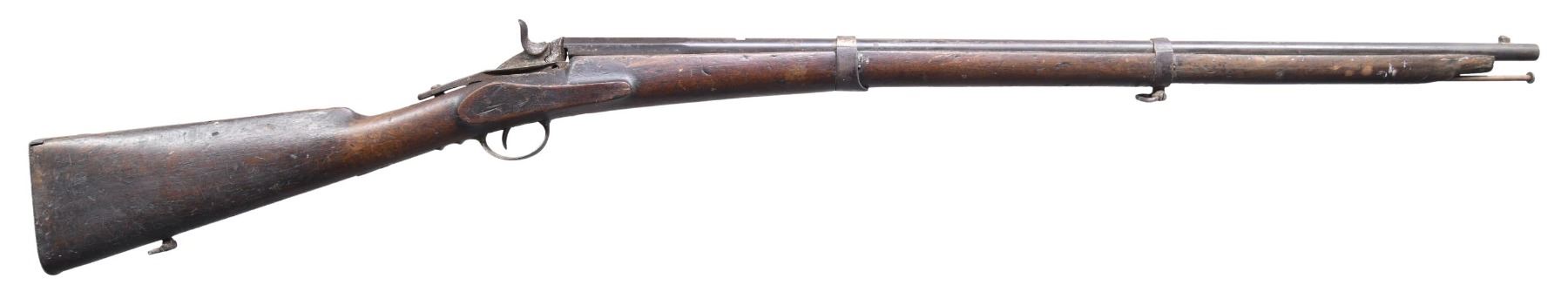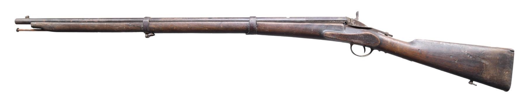 Cal. 32 RF. NSN. Barrel 28" with Belgian proof marks forward of breech on left side. Barleycorn front sight & rear dovetail. Walnut musket stock with iron furniture. CONDITION: parts missing include front barrel band, rear sight, breech block lever; right side of breech block recoil shield broken off and missing. Poor corroded & oxidized metal. Fair wood finish with numerous marks & dents, large gap to top tang. Dark bore. (25-548/MD). CURIO. $50-100.