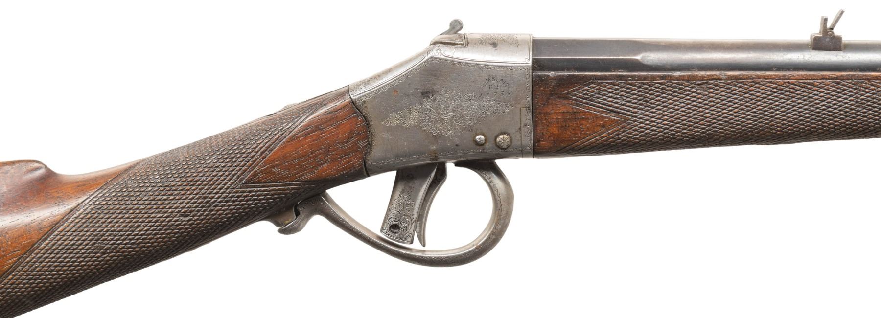 Cal. 360. S# 11739. Rnd. 26.5" bbl. w/ pre-1893 Belgian proofs. Blade front sight & 2 leaf rear sight. Comblain action w/ assembly # "21" & sprays of acanthus scroll engraving. Checkered walnut stock set w/ forearm numbered "332" & steel buttplate. CONDITION: barrel has fair fading blue mixing with gray/brown patina showing scattered marks & light pitting with 1 area of deep pitting on underside of barrel under forearm. Receiver has gray patina appearance with light pitting. Wood has good appearance with numerous dings & sm. chips. Bore shows strong rifling with pitting. PROVENANCE: Estate of Groves Herrick. (01-28892/MD). ANTIQUE. $400-600.