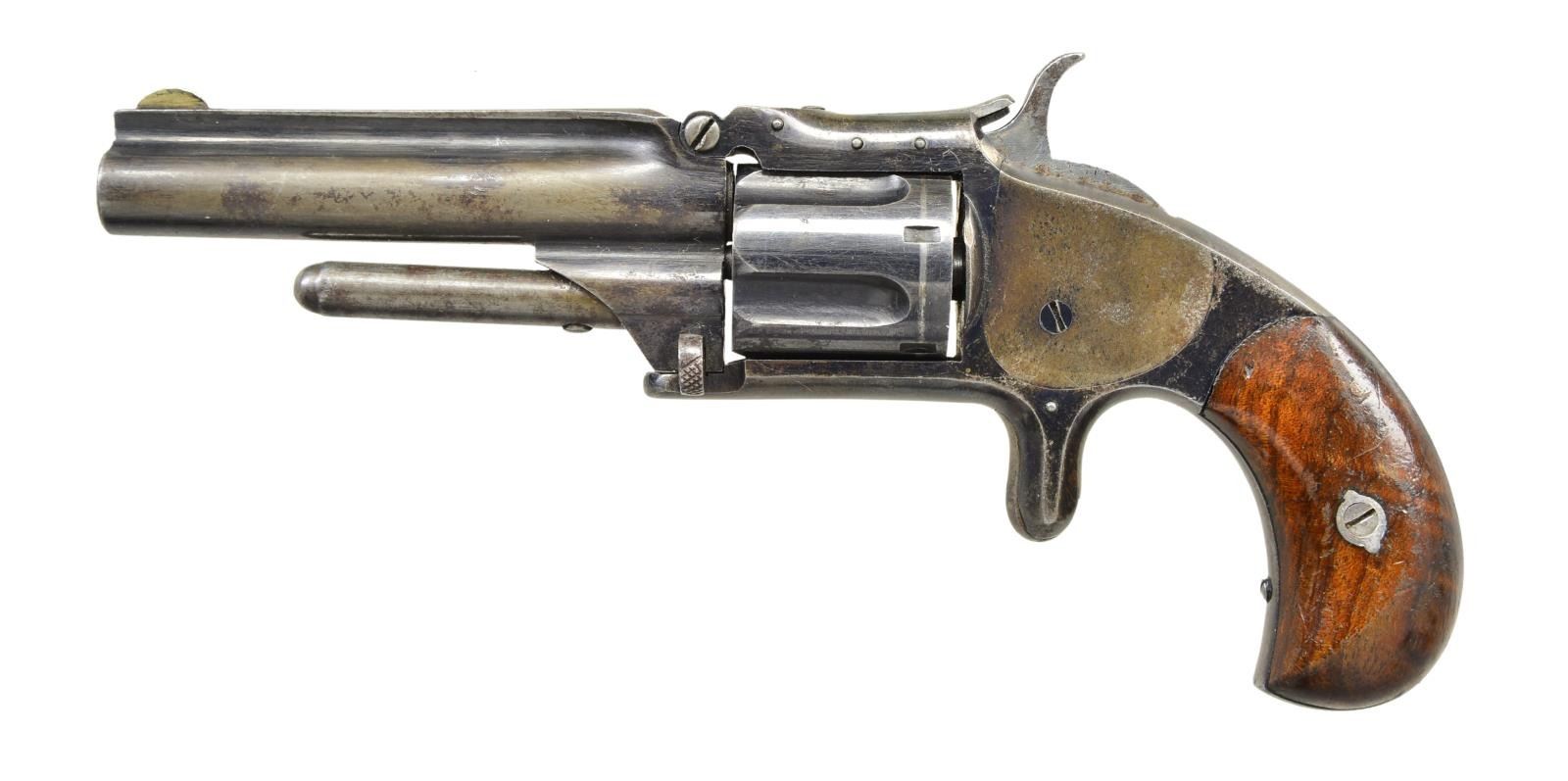 REVOLVER. Cal. 32 RF. S# 27 (under grips). This revolver appears to be a fine executed Belgian copy of Smith & Wesson No. 1 1/2 tip up revolver w/ crown "N" proofs on bbl. & cyl. along w/ "ELG" proof on bbl. Frame under grips have various maker's marks: "MM", "GR", "MR" & crown "IA & C". Bbl. 3 1/2" rnd. w/ rib, circular front sight & marked "SMITH & WESSON'S PATTERN MASS PAT. APR. 2.33 JULY 6.31 & NOV 24.43". Assembly # "22" on bbl., 5 shot fluted cyl. & 2 piece walnut grips. UNATTACHED ACCESSORIES: walnut dsiplay case w/ green felt interior & antique box of Remington-UMC 32 S&W (50 RDS). Box in good condition w/ light marks, sm. tears & tape. Brass key plate missing pin & is loose to box. CONDITION: metal has fair blue coverage in protected areas w/ brown patina on bbl., sideplate & frame showing areas of peppery oxidation, silvering on edges & cyl. turn line. Grips have good finish w/ light marks & escutcheons loose. Very good bore. (01-22082/MD). ANTIQUE. $500-1,000.