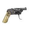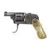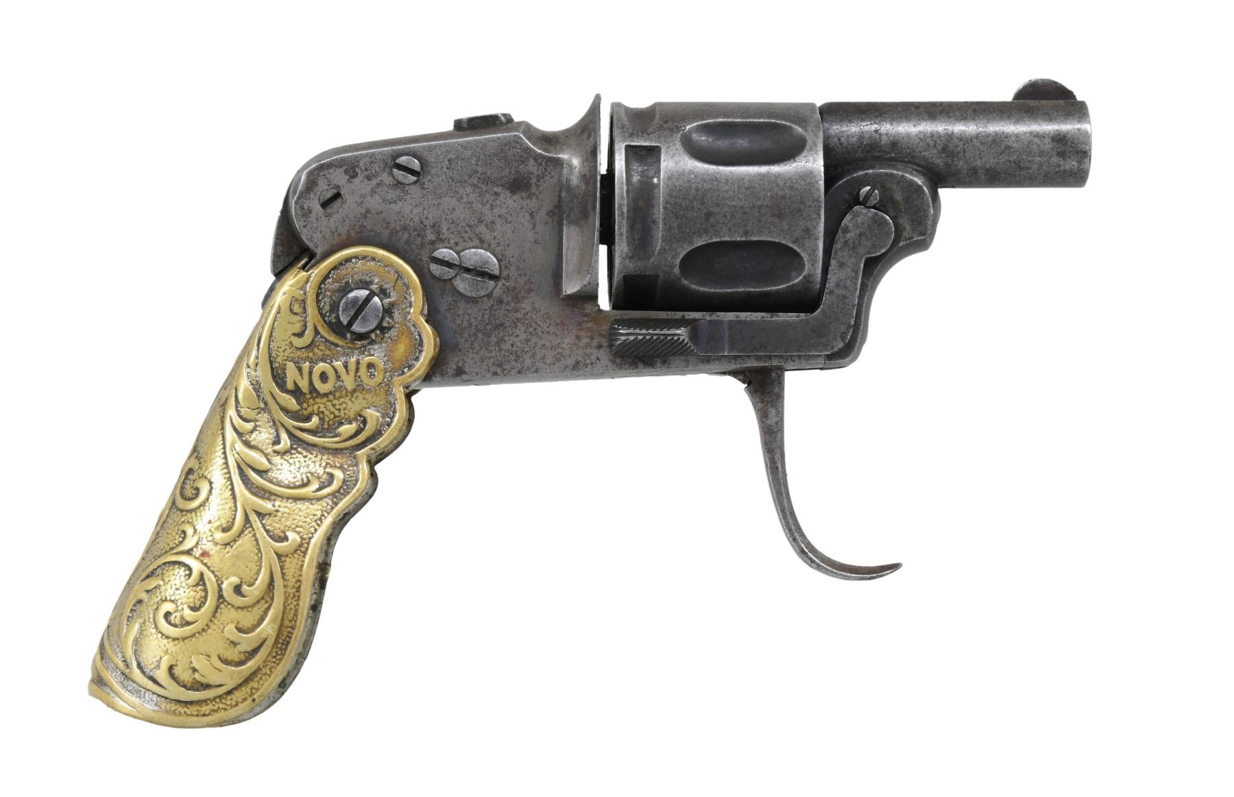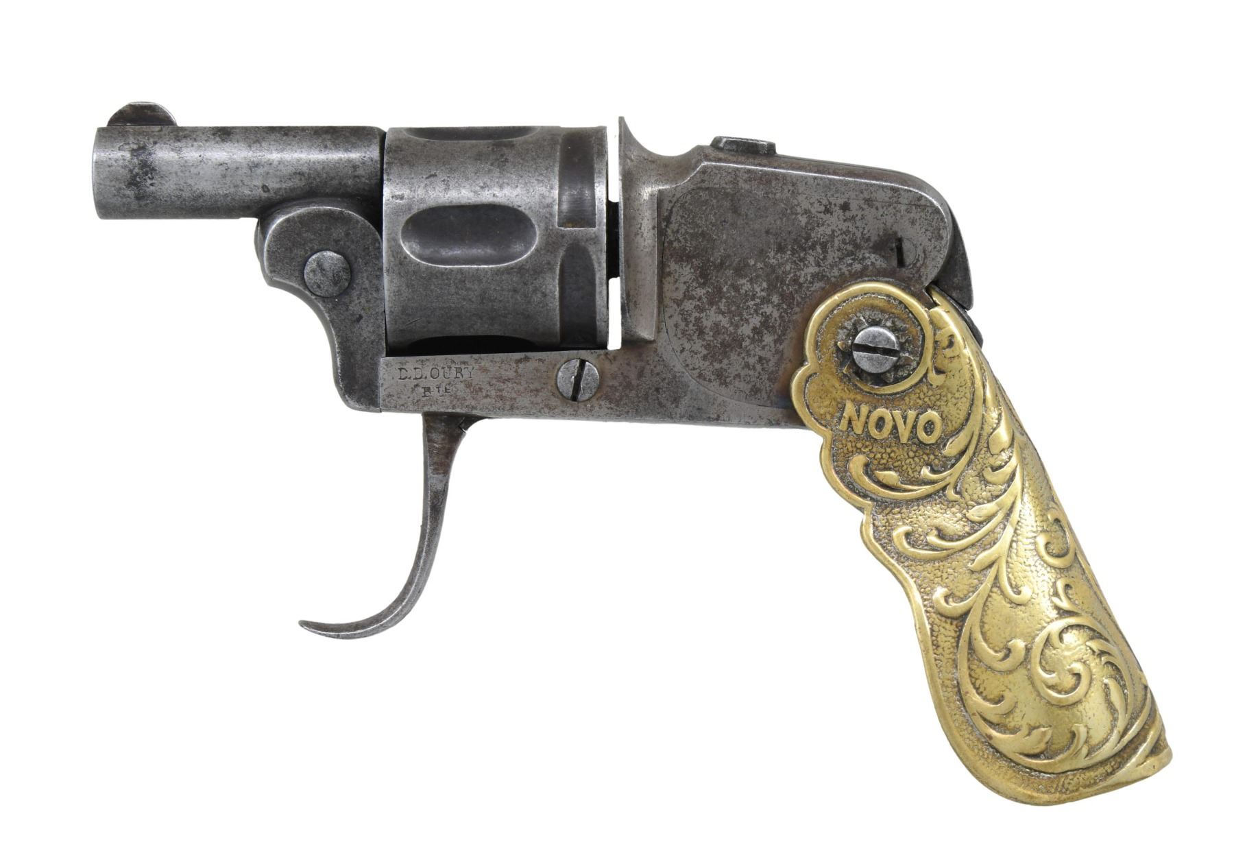 ACTION REVOLVER. Cal. 6.35mm. NSN. Bbl. 1 1/4". Folding grip and trigger, double-action revolver, mfg. in Belgium by D.D. Oury. Left side of the frame is marked "D.D. OURY/ BTE". Right side of the frame, bbl., as well as the rear face of the cyl., exhibit Belgian commercial proofs. Frame is mounted with a 1-piece "NOVO" stamped brass folding grip, which is embellished with scrollwork on a textured background. Half-moon blade front sight, with diminutive notch rear sight. CONDITION: Metal components retain a mottled gray patina, with scattered spots of light to mild pitting present overall. Bright bore, exhibiting some scattered spots of oxidation, while retaining well-defined rifling throughout. Brass grip exhibits a mellow patina. (24-6981/MLW). CURIO. $200-400.