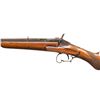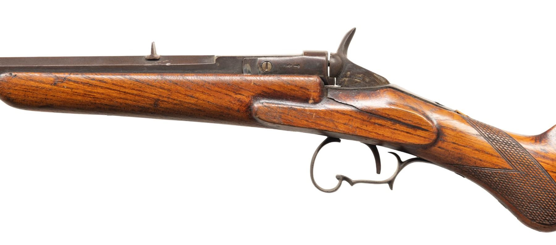 RIFLE. Cal. 4.5mm. S# 419. Bbl. 23 1/8". Breechloading single shot parlor rifle produced by an unknown mfg. in Belgium. Bottom flat of the bbl. is marked "BELGIUM", followed by "419". Left side of the receiver is marked with 4 Belgian commercial proof marks above "PL.22.L", with 2 additional Belgian proofs marked on the left side of the swiveling breech and the hammer. Right side of receiver and breechblock are marked "45". Sanded and refinished 1-piece plain wood half-stock features checkered panels on either side of the wrist. Dovetailed blade front sight and V-notch rear sight. Left breechblock screw is an apparent replacement. CONDITION: metal components have faded to a gray/brown patina, exhibiting light to mild dark surface oxidation overall. Relatively bright bore, exhibiting scattered spots of light to mild pitting, while retaining fair to good rifling throughout. Proper manual mechanics, although the striker spring appears to be absent. Stock shows scattered marks and impressions from handling and storage, with a large crack present on the left side stemming from the receiver / breechblock area, as well as a notable chip on the wrist to the rear of the upper receiver tang. PROVENANCE: Estate of Groves Herrick. (25-5645/MLW). CURIO. $75-150.