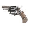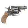 Cal. 7.65mm. S# 32. Bbl 1 3/4". Round blade front sight. Fixed rear sight. Left side of frame marked "1" & "32". Right side of frame marked w/ "(Crown)R" & "(Star) AB" proofs. Rear of cyl. marked w/ circled "E LG" Liege proof. Ejector rod is bent & loose. Hammer not cocking cyl. & gun appears to be missing some parts. Checkered hardwood grips. CONDITION: shows scattered flattened points, dings & handling wear. Metal is mostly a gray patina w/ remnants of blued finish, scattered pitting & oxidation. Bore shows scattered frosting & pitting but evident rifling. PROVENANCE: The Collection of Gun Sport Ltd owned by Jon R. Thomas. (23-4604/MJC). CURIO. $200-300.