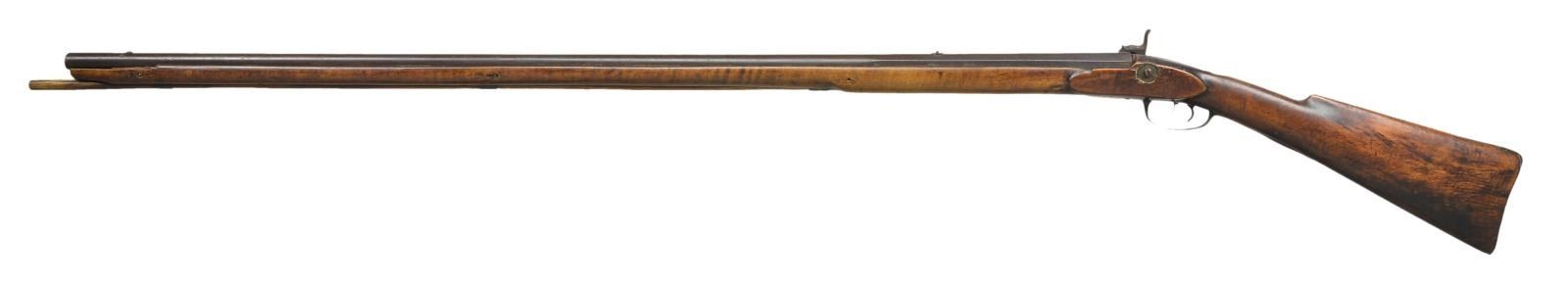 Cal. 62. NSN. Bbl. 42" round w/ octagon shank & smoothbore. Top flat has partially visible London marking followed by Belgian black powder proof mark. Small blade front sight w/ fixed square notch rear sight. Side lug style bolster. Plain unmarked hammer & lock. Double set triggers. Pin fastened full length maple stock w/ iron fittings. Hardwood ramrod. WEIGHT: 5 lbs, 12 ozs. CONDITION: metal has dark patina appearance w/ heavy pitting in breech area. Stock shows heavy wear w/ cracks & chips in butt, tang, lock & forearm areas. Trigger must be set for lock to hold in cocked position. Dark pitted bore. (01-22798/DS). ANTIQUE. $300-500.