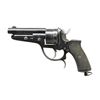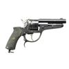 Cal. 9mm. S# 18548. Bbl. 3 3/4" with flat topped rib having semi circular sight blade. Mfg. in Belgium from late 1860's to early 1870's as double action. Patented in 1868; that is the normal model designation although some use 1870. Galand was French inventor who worked primarily in Belgium and France. The revolver design was also produced in England. Open top frame that was changed to closed top via 1872 patent. Offered in 9mm for military use and 12mm for civilians. Significant order to Russia in early 1870's. Front of cylinder has Leige proof without crown as used 1811-1892; 1893 onward had crown. The 1 of the serial number is on the barrel extension and also on the cylinder, extractor plate, link from lever to barrel and on the back of both border checkered wood grips; 1 may likely be an assembly number. References show many examples of top of backstrap; this one is less pronounced than most. Finely blued finish with polished in the white trigger and hammer. Capped butt with lanyard loop. Finely made with attention to fit and finish. CONDITION: very good overall having some light and peppery oxidation mostly on top of barrel. Finish is far superior to most examples found by internet search. Front lever pivot screw is a finger tight replacement of too short a length. Some screws retain bright fire blue. Grips have very minimal handling marks, but active spots of oxidation on backstrap. Bright bore with distinct rifling having very minimal wear and some areas of cleaned light pitting. (01-22297/NW). ANTIQUE. $650-900.