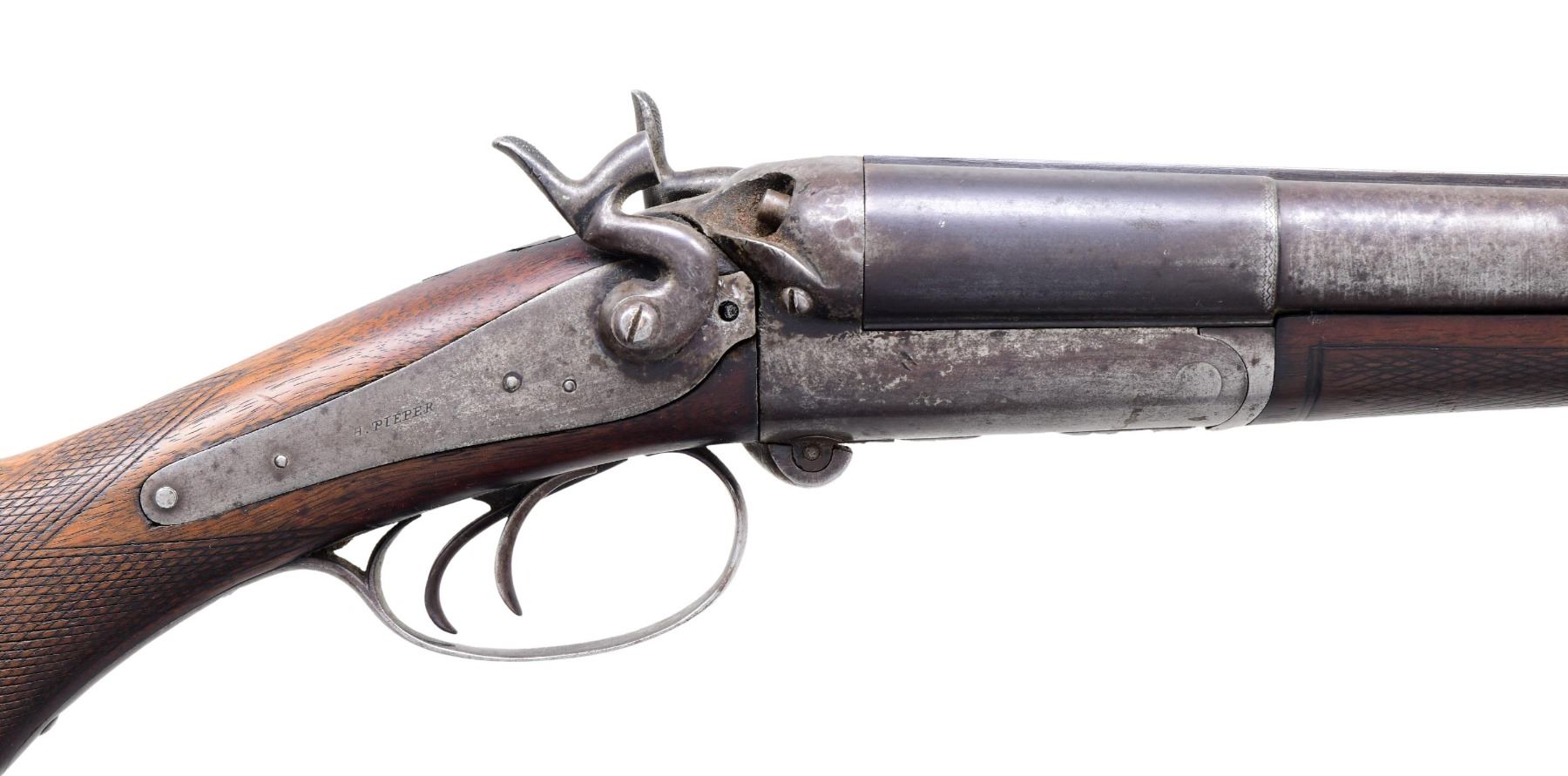 Cal. 12 Ga., 2 5/8". S# 16806. Twist steel 30" barrels with brass bead & H Pieper patent markings on rib. Mod chokes. Water table has Pre 1893 Belgian proofs. Lefaucheux style back action locks marked "H PIEPER". Side lever opening, double triggers & extractors. Walnut splinter forearm & rnd. knob pistol grip buttstock with horn buttplate. CONDITION: balance of metal has brown patina appearance with black finish on bottom of barrels, spots of oxidation & marks throughout. Worn food finish with heavy dents, cracks & large break at left side of wrist around action. Poor buttplate. Right lock action screw is broken & is unable to drop hammer from full cock. Bores shows pitting. (01-27023/MD). ANTIQUE. $250-350.