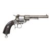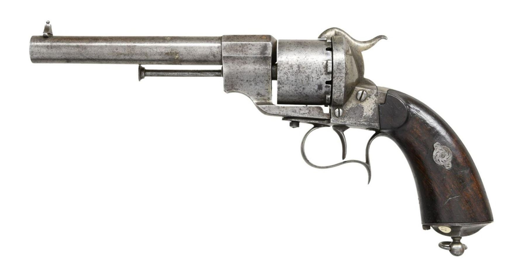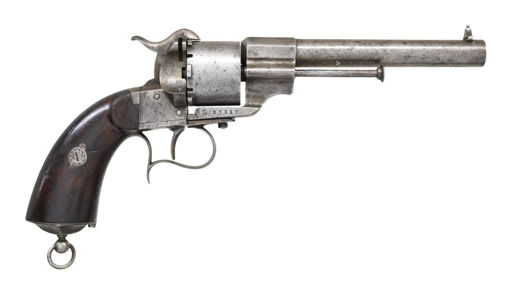 Cal. 11mm Pinfire. S# 27329. Bbl. 6 1/4" with a raised bead front sight. 6-Shot cyl. is marked "15" on the face. Partial markings on the left side include "BREVETE." Two-piece wood grips. There is a lanyard ring on the scalloped butt. CONDITION: metal has a gray patina appearance with scattered spots of oxidation. Frame is missing its loading gate. Grips have a worn finish with numerous marks. Good bore with straight rifling, fouling, and pitting. (01-21042/MD). ANTIQUE. $400-600.