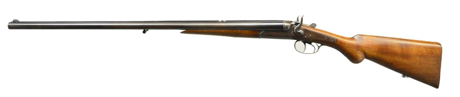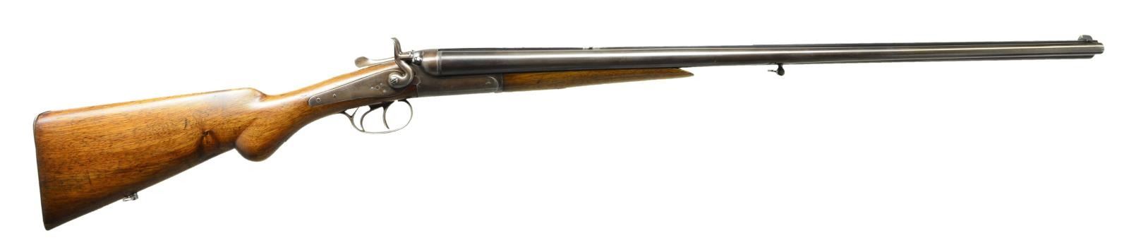 Cal. Unknown 8.8mm cartridge. x 16 Ga. S# 32101. The 27.5" bbls. have sling swivel, matted rib, blade front sight & flip up rear sight. The rifle cartridge closedly resembles the 360 NE 2 1/4" w/ 0.42" base, 0.375" neck, 2.38" case length, 0.353" bullet, 0.504" rim & 0.05rim thickness. Back action hammer locks w/ dbl. triggers & extractors. Walnut forearm & rnd. knob pistol grip stock w/ sling swivel. LOP: 13 1/8" to buttplate. CONDITION: Bbls. have good lightly faded reblued finish w/ prior pitting & turning brown near breech. Receiver has even brown patina finish w/ light scratches & marks. Sanded & refinished wood has prior marks & scratches. Fair pitted shotgun bore & good rifle bore w/ light frosting in grooves. (22-5959/MD). CURIO. $400-600.