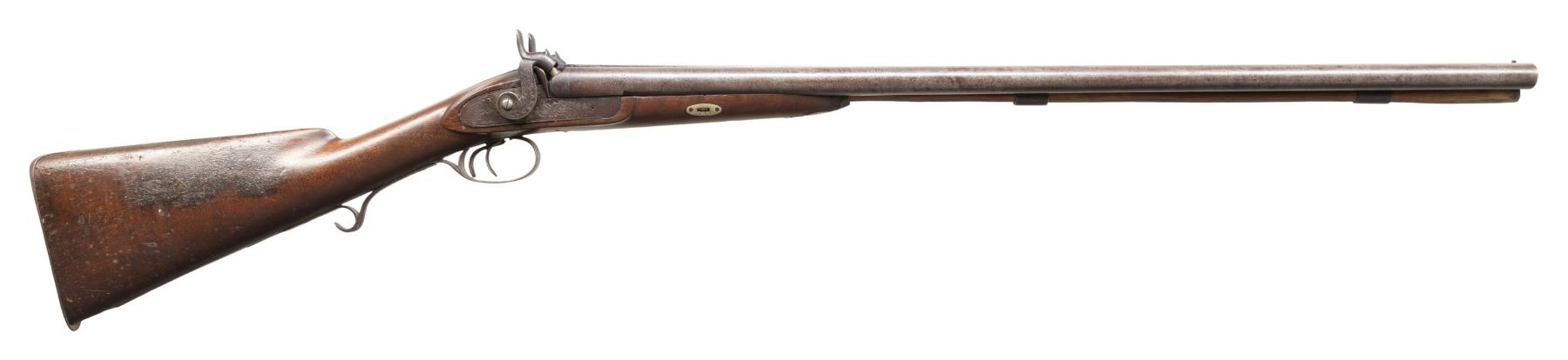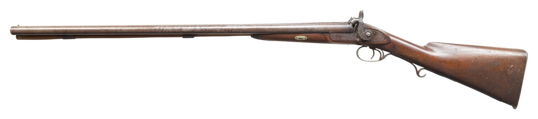 Cal. 12 Ga. NSN. Bbls. 29.5" w/ bright front stud & modern replacement nipples. Engraved hammer locks. Wedge fastened walnut stock w/ German silver wedge escutcheons, additional finger rest added to spear tipped finial triggerguard & metal buttplate. CONDITION: gray/brown patina barrels & lock with spots of corrosion & marks. Fair wood finish with extra finish on right side buttstock. Fair pitted bores. Mechanically fine. PROVENANCE: Estate of Groves Herrick. (01-28317/MD). ANTIQUE. $100-200.