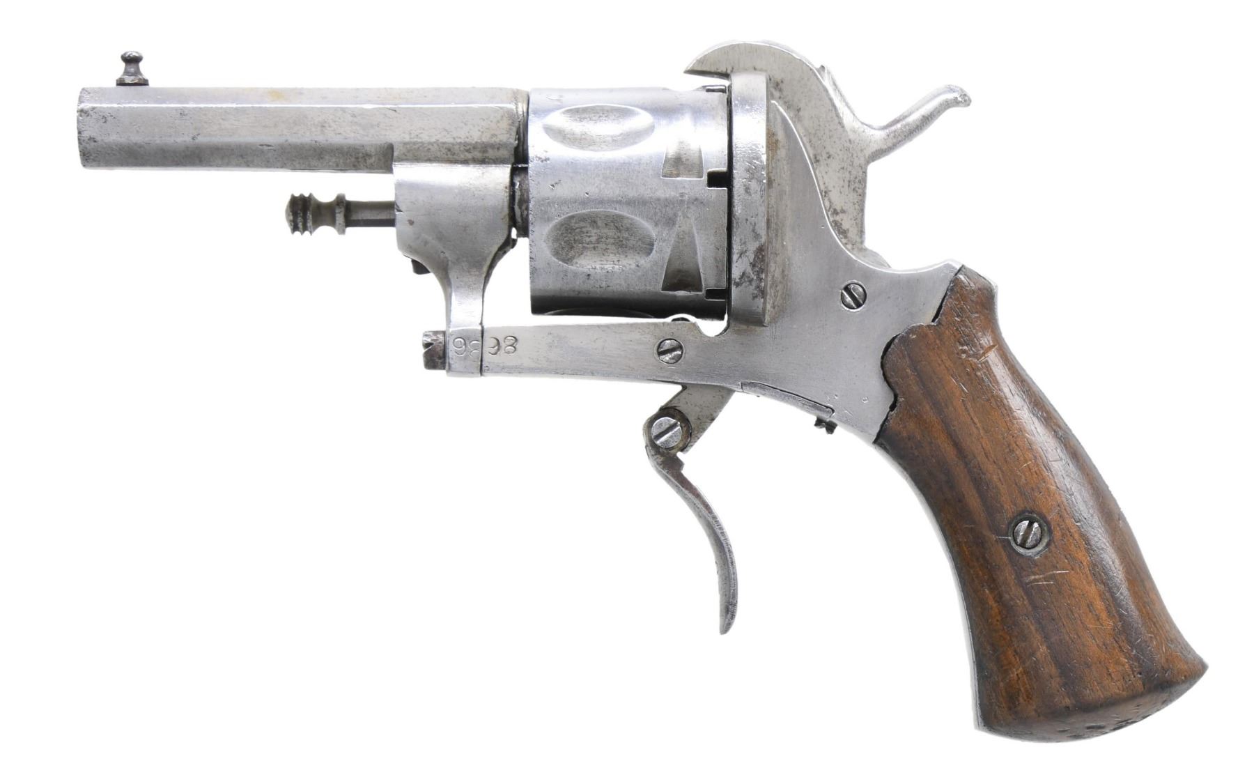 Cal. 7mm. S# 98. Bbl. 2 1/4". Post front sight. Right rear of bbl. has Belgian crown "R" proof. Folding trigger. Renickel finish. Smooth hardwood grips. CONDITION: grips have an older finish, with scattered dings, scratches, and handling marks. Metal retains much of its renickel finish, with scattered pitting, oxidation, and dings. Action is not cocking when hand-cycled. Pitted, worn bore. (01-26032/MJC). ANTIQUE. $200-300.