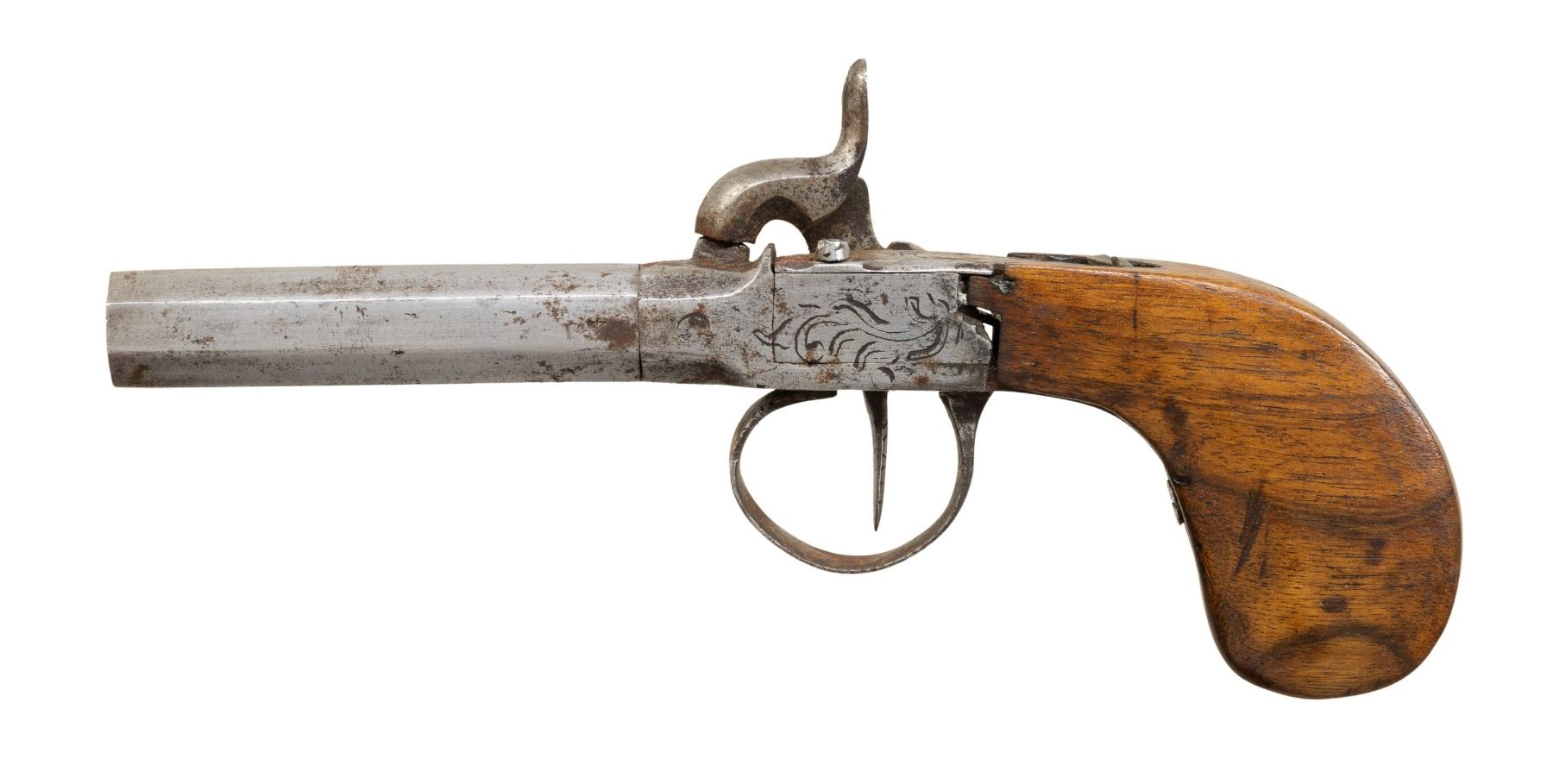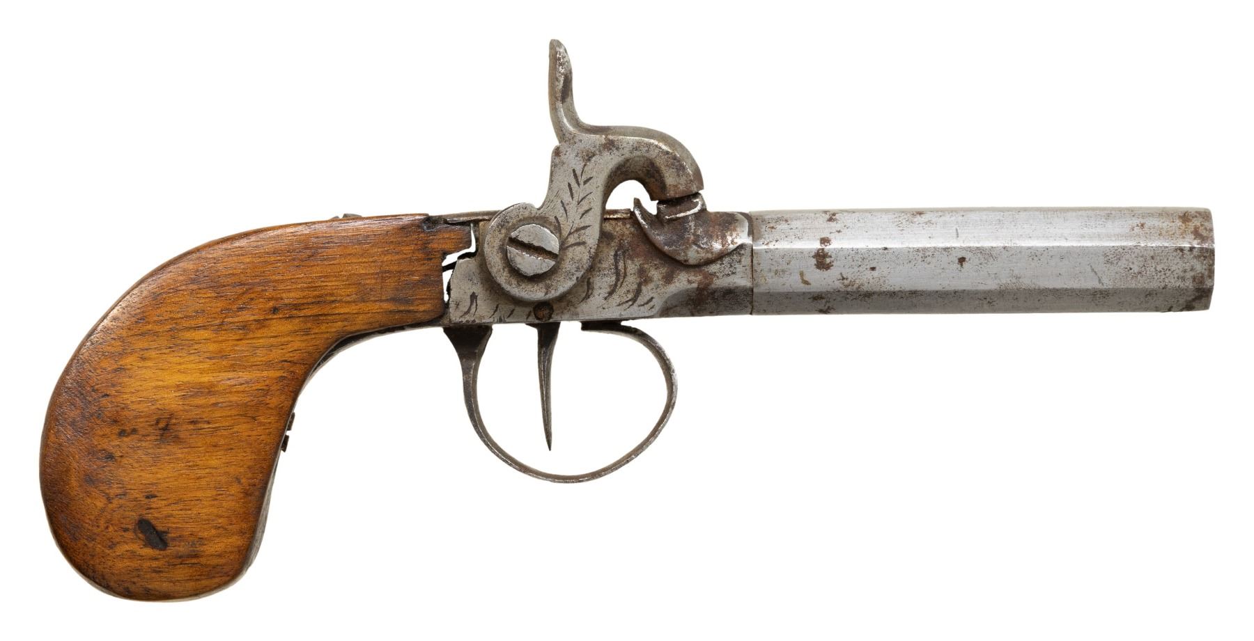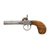 Cal. 45 Smoothbore. NSN. Bbl. 2 15/16". Screw barrel percussion pistol produced by an unknown mfg. in Belgium. Left side of the receiver exhibits a partially visible apparent Belgian proof at the breech, with an apparent German Crown/N marked on the left flat of the bbl. Sides and top of the receiver, side of hammer, and underside of trigger guard bow exhibit light foliate pattern engraving. Metal components have been cleaned in-the-white at one time. 1-piece plain wood stock has been sanded and refinished at one time. Top receiver tang screw is a contemporary brass replacement. CONDITION: metal components exhibit scattered spots and patches of light surface oxidation and varying degrees of pitting overall. Dark pitted bore. Action is weak, with the percussion nipple having chipped. Stock shows some scattered marks and impressions from handling and storage, with some chipping along forward edges at frame. (01-28576/MLW). ANTIQUE. $75-150.