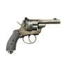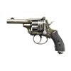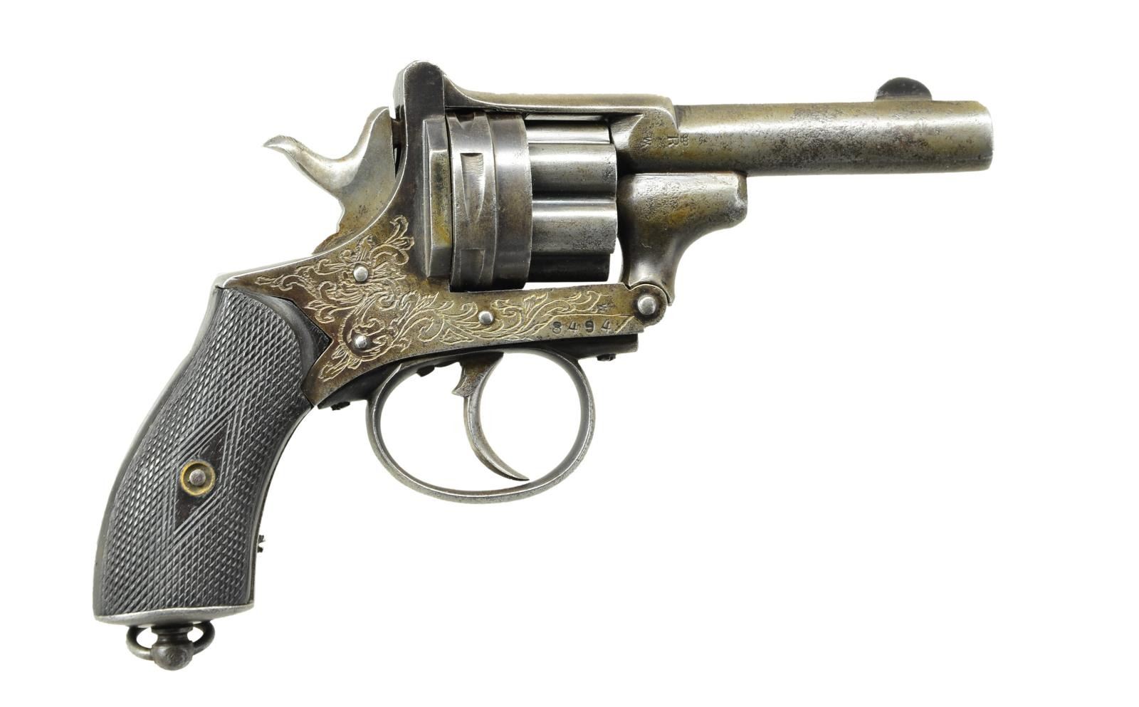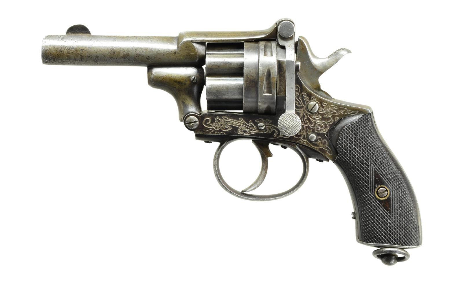 Cal. 320 Revolver. S# 8494. Oval 2 7/8" bbl. w/ circular front sight & top strap. Revolver has "JB" marked inside grip frame (possibly Joseph Bertrand) along w/ various Belgian crown "R", crown "C", star "W", crown "AH" & Liege proofs. Unusual action in which bbl. tips up to expose 6 shot fluted cyl., cyl can be removed easily to unload & load 6 cartridges, then inserted back into a extended base to cycle cylinder. Action is scroll engraving. 2 Piece wooden grips. Lanyard ring on butt. CONDITION: bbl. has brown patina appearance w/ prior pitting & marks. Action faded to brown patina w/ blue in protected areas along w/ light pitting, pinprick oxidation, scratches & marks. Hammer & latch have faded to gray patina w/ light marks. Good finish on grips w/ light marks. Bore has fair overall appearance showing unusual imperfection with rifling groove improperly. (01-21771/MD). ANTIQUE. $500-750.