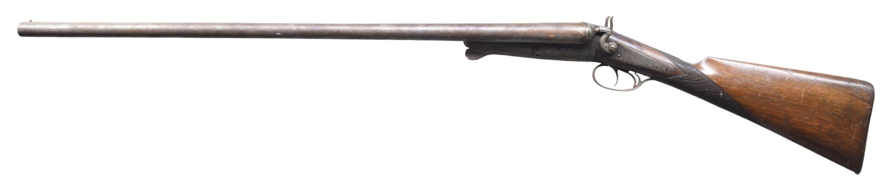 Cal. 12 Ga., 2 1/2" blackpowder. S# 21646. The 30" barrels have brass front bead & Pre 1893 Belgian black powder proofs. Mod chokes. Lefaucheux back action hammer locks with rebounding firing pins & metal underlever opening. Walnut straight grip buttstock with metal buttplate. CONDITION: metal is brown patina appearance with oxidation & pitting. Worn wood finish with deep marks. Bores show previous light pitting with some shine. (01-26239/MD). ANTIQUE. $50-100.