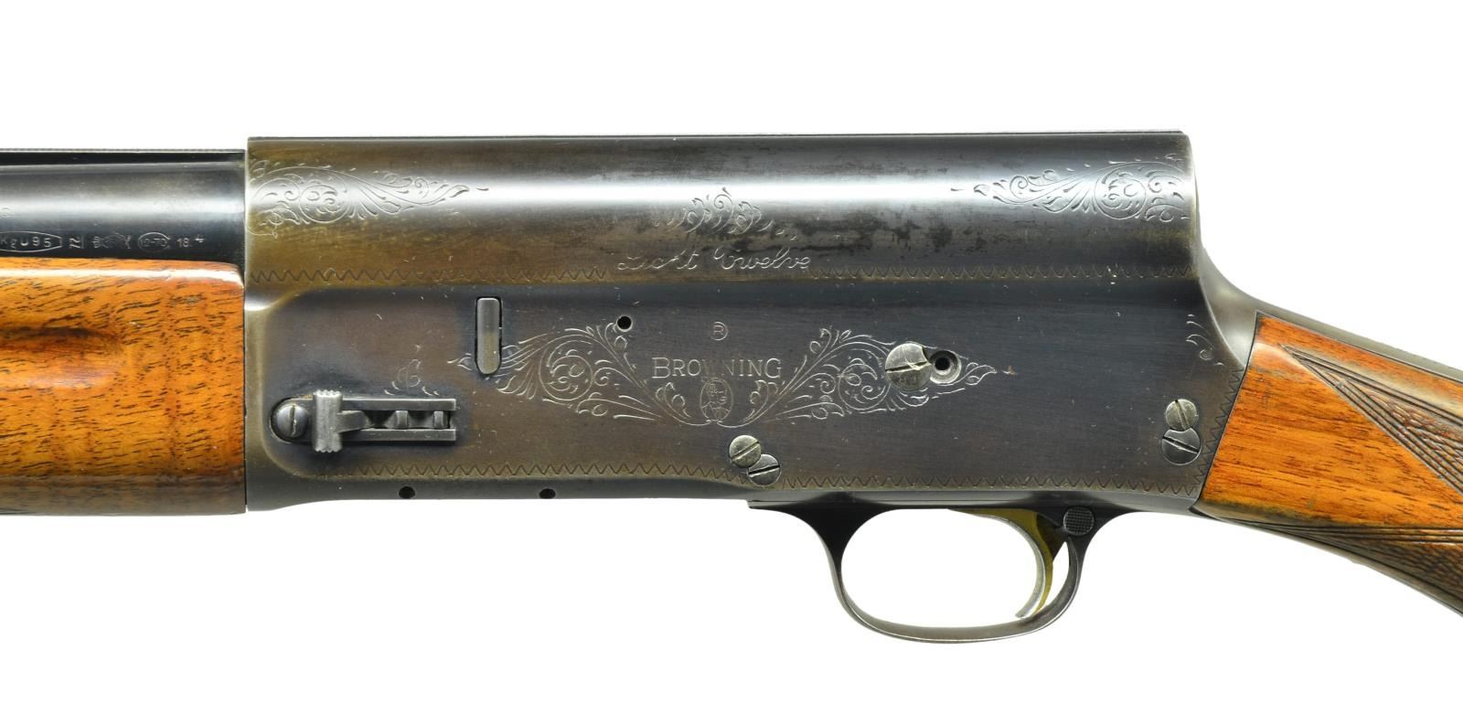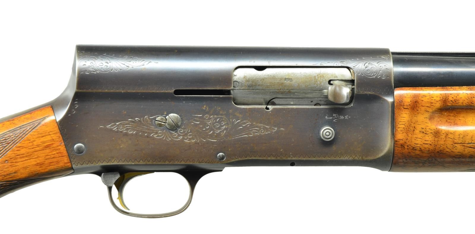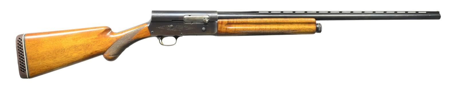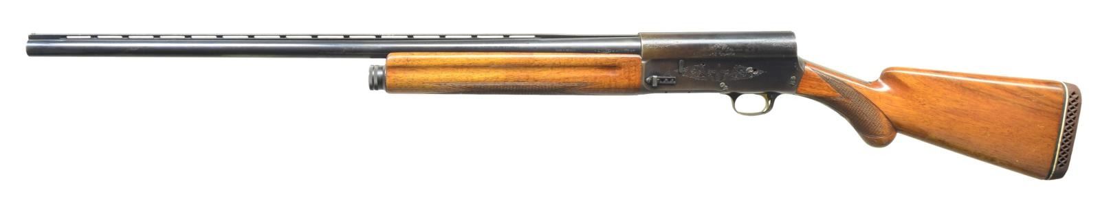 SHOTGUN. Cal. 12 Ga., 2 3/4". S# 1G44135. Bbl. 28" VR w/ a fixed full choke. Steel front bead. Recoil operated square stern action w/ Grade I scroll engraving. Blue finish. Gold finished trigger. Finger groove forearm & rnd. knob pistol grip walnut stock w/ hand checkering. LOP: 15 3/8" over a poorly fit aftermarket White Line pad. 1961 Belgium mfg. CONDITION: bbl. retains 90% blue showing action & muzzle wear. Receiver retains 70% dull blue fading to brown. Retainer screws from right side of action & trigger guard are missing. Wood has worn finish & checkering showing scratches & handling marks. Good mechanics. Bore is generally bright showing some roughness & a light ring in choke area. (21-4351/DS). CURIO. $300-450.