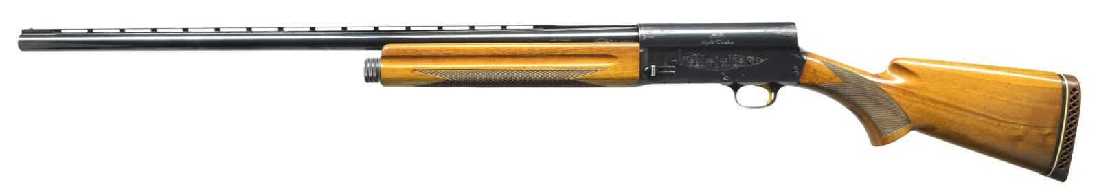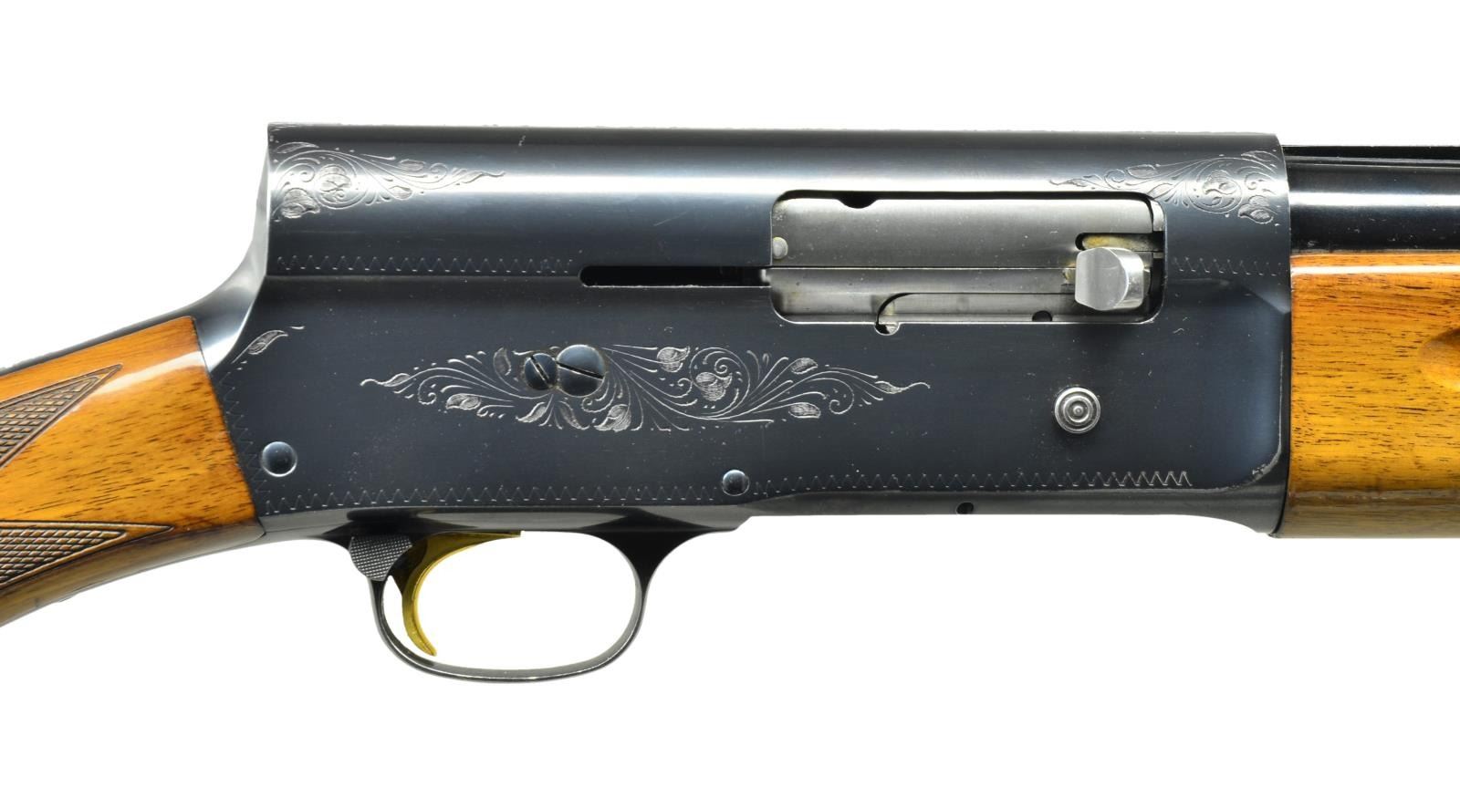 SHOTGUN. Cal. 12 Ga., 2 3/4". S# 71G88527. Bbl. 27 1/2" w/ 1/4" VR, steel bead & fixed full choke. Blue finish. Recoil operated action has scroll ornamentation & zig-zag highlights. Gold finished trigger. Forearm & long tang flat knob pistol grip stock of gloss finished European walnut w/ cut checkering. LOP: 14 1/4" to replacement Browning ventilated pad. 1971 Belgium mfg. CONDITION: very good blue wear & handling marks. Very good wood finish showing light handling marks & scratches throughout. Bright bore w/ streaks of fouling. (21-4272/MD). CURIO. $500-700.
