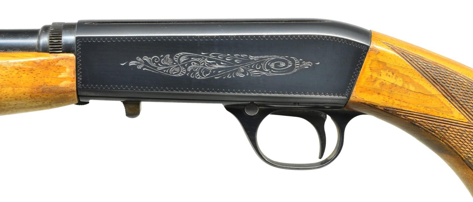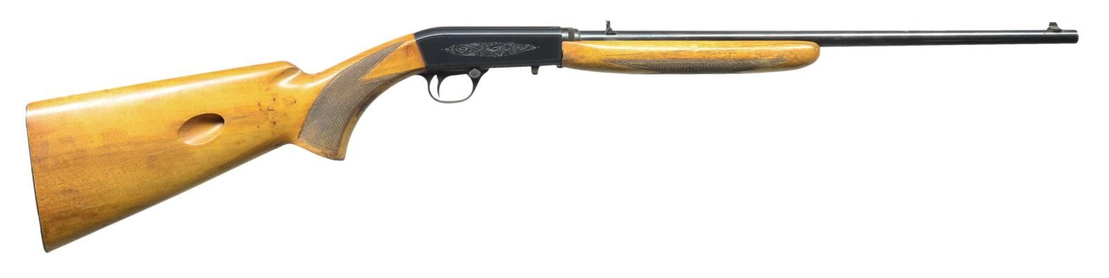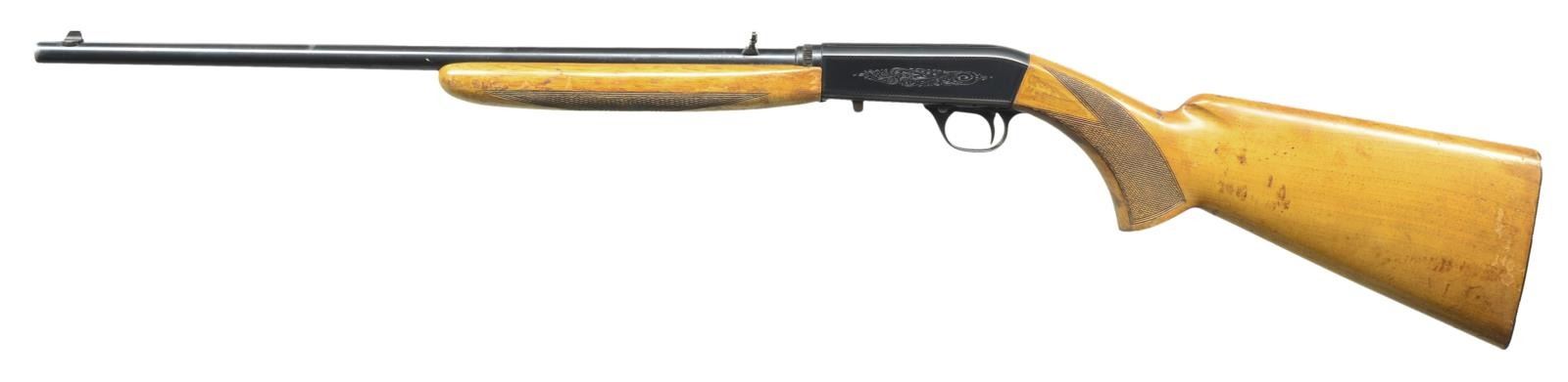 RIFLE. Cal. 22 LR. S# 2T46316 (1962). Bbl. 19 1/2" rnd. w/ bead front sight & folding leaf rear sight. Bottom eject takedown action w/ Grade I scroll highlight & borderline engraving. Blue finish. Beavertail walnut forearm & pistol grip stock w/ grooved steel buttplate & hand checkering. Mag. tube inserts through buttplate & load through right side. CONDITION: 85% blue showing carry & edge wear w/ 2 spots of gun rack wear on bbl. Wood has blistered & peeling finish showing numerous dents & handling marks. Functioning action, spring & plunger for takedown latch are missing. Bore retains strong rifling. (21-4365/DS). CURIO. $350-500.