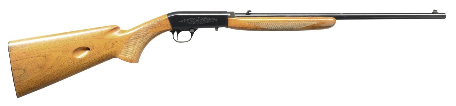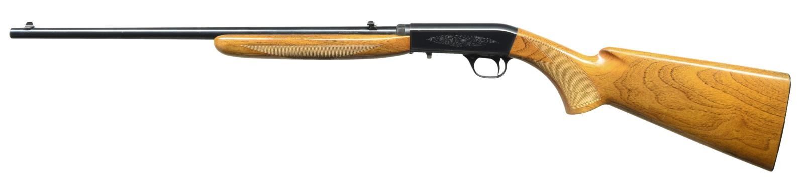 RIFLE. Cal. 22 LR. S# 7T64999 (1967). Bbl. 19 1/2" rnd. w/ bead front sight & folding leaf rear sight. Bottom eject takedown action w/ Grade I scroll highlight & borderline engraving. Blue finish. Beavertail walnut forearm & pistol grip stock w/ grooved steel buttplate & hand checkering. Mag. tubes inserts through buttplate & load through right side. CONDITION: over 97% original blue showing light edge wear & marks w/ spot of gun rack wear on bbl. Original wood finish shows crazing w/ scattered sm. handling marks. Sound mechanics. Bright near excellent bore. (21-4305/DS). CURIO. $700-1,000.