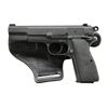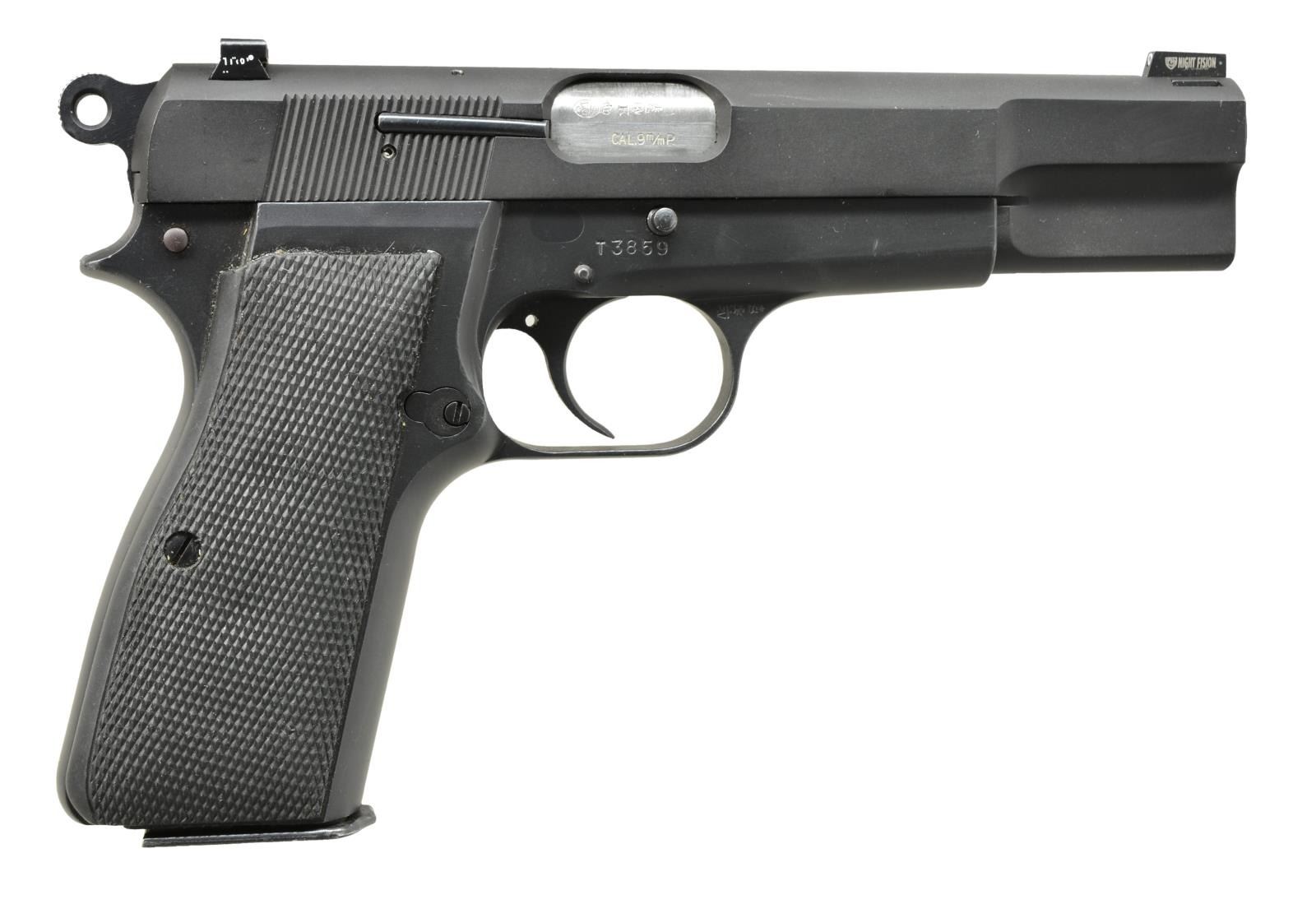 Cal. 9m/m P (9mm Luger). S# T205859 & T3859. Bbl. 4 3/4". Mfg. 1967 w/ rnd. spur hammer. Long S# on front strap as normal plus short S# on right side above trigger as normal on early models. Matte black finish throughout w/ in the white bbl. Extended thumb safety, checkered rubber grips & Night Fision 3 dot night sights; dovetailed front. Import marked on butt. MAGS: 1 very good 13 rd. w/ plastic follower & push button base. UNATTACHED ACCESSORIES: very good black thumb break high ride holster marked only w/ "45 AUTO". CONDITION: near excellent overall appearing commercially applied matte black finish. Missing mag safety in trigger. Near excellent bore & grips. (21-2838/NW). MODERN. $650-900.