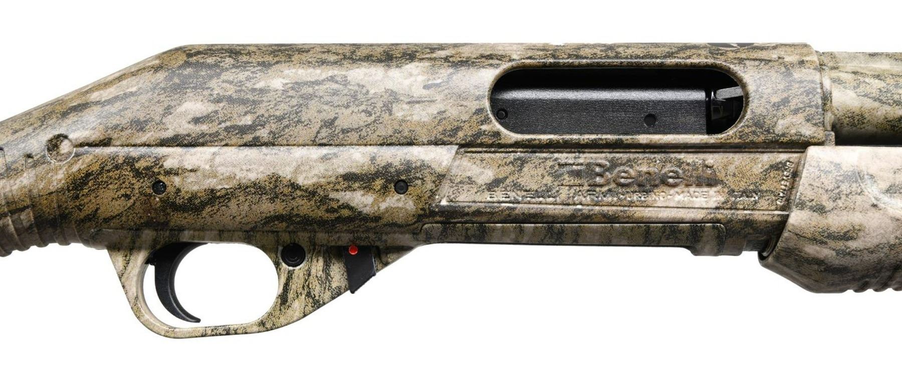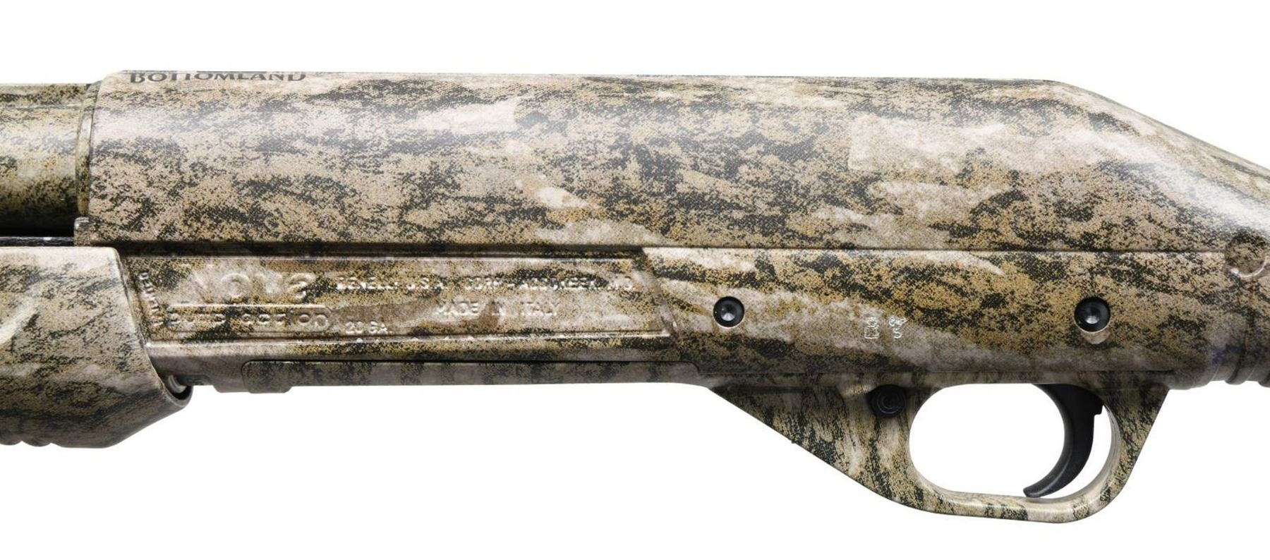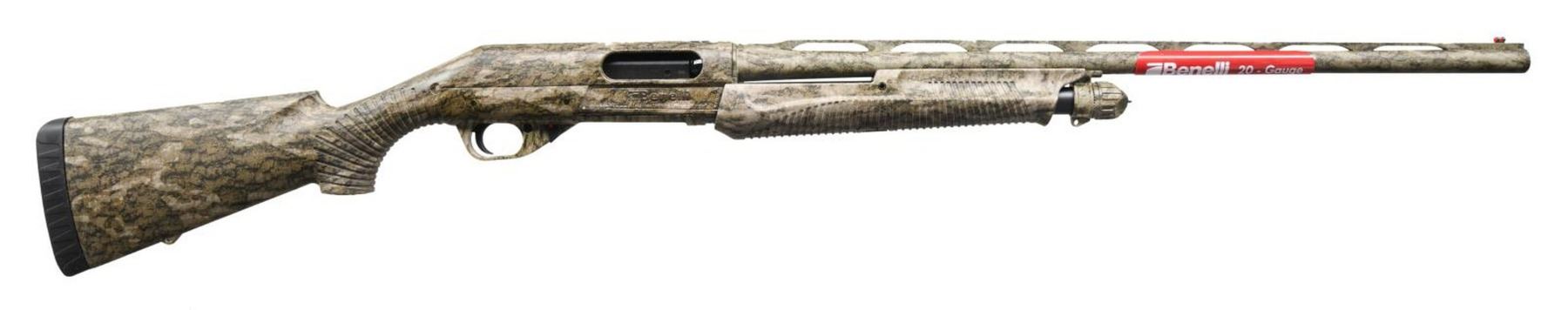 FACTORY BOX. Cal. 20 GA, 2 3/4" & 3". S# BA102809R. Bbl 25 3/4". Nova pump action shotgun manufactured by Benelli in Italy and imported by Benelli U.S.A. The left side of the bbl. exhibits Benelli's manufacturer information, with the cal. designation on the right. Left side of receiver exhibits markings stipulating the model designation, followed by Benelli U.S.A.'s importer information. Polymer furniture, barrel, and polymer furniture exhibit Mossyoak's Bottomland camouflage finish. High vent rib with red fiber optic front sight and removable Improved Cylinder choke. UNATTACHED ACCESSORIES: matching factory box containing factory paperwork. CONDITION: near new, with metal components retaining virtually all of their original factory finish overall, exhibiting few minute superficial marks from handling and storage. Mirror bore. Polymer furniture is excellent. Box shows some mild exterior wear from storage and handling, but otherwise remains sturdy and serviceable. PROVENANCE: The Collection of Gun Sport Ltd owned by Jon R. Thomas. (23-3416/MLW). MODERN. $400-600.