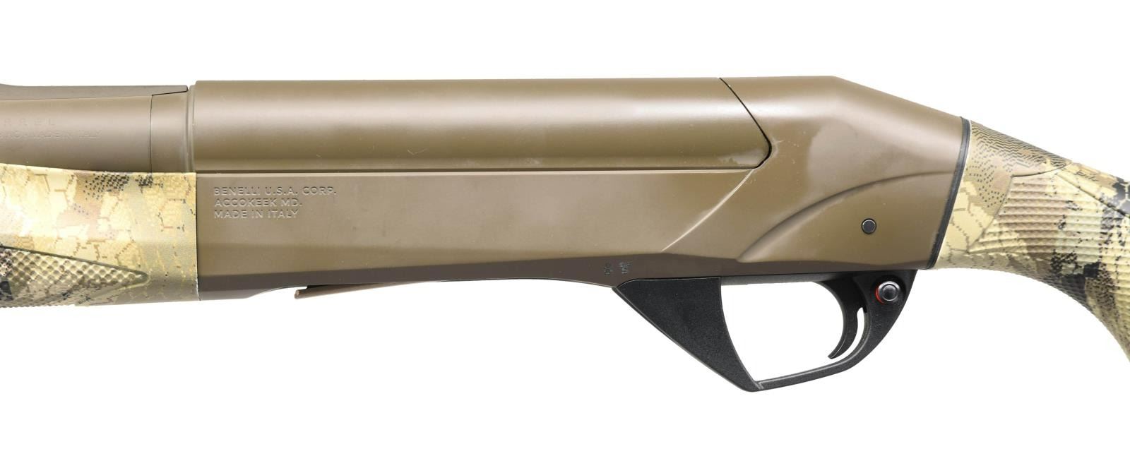 Cal. 12 Ga 3 1/2". S# U699916V. Bbl. 28" VR choked IC. Red fiber optic front sight. Gray parkerized finish. Red factory plastic banner present on bbl. Camoflauge pistol grip stock w/ factory recoil pad. LOP: 14 1/4". UNATTACHED ACCESSORIES: factory box matching numbered to gun w/ hardcase, four spare chokes, manual & can of Ben Oil. CONDITION: all aspects near new in box. PROVENANCE: The Collection of Gun Sport Ltd. owned by Jon R. Thomas. (23-3415/MJC). MODERN. $1,500-2,000.