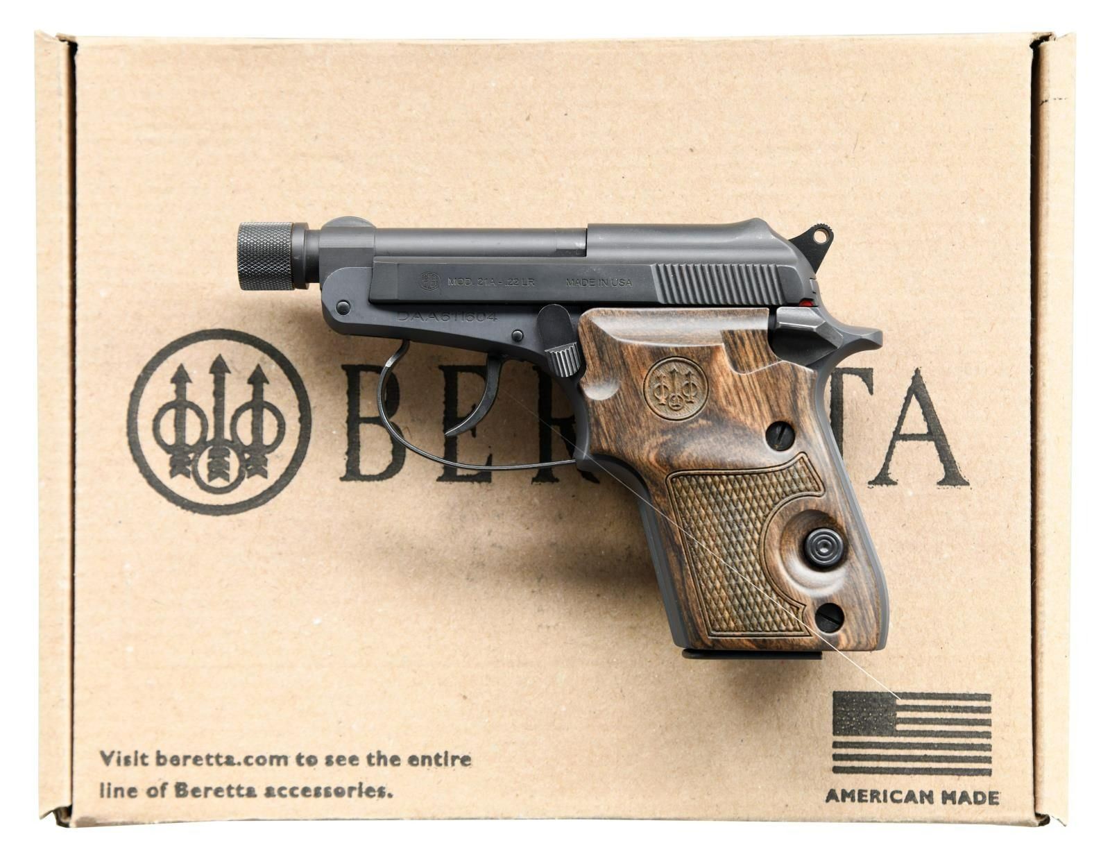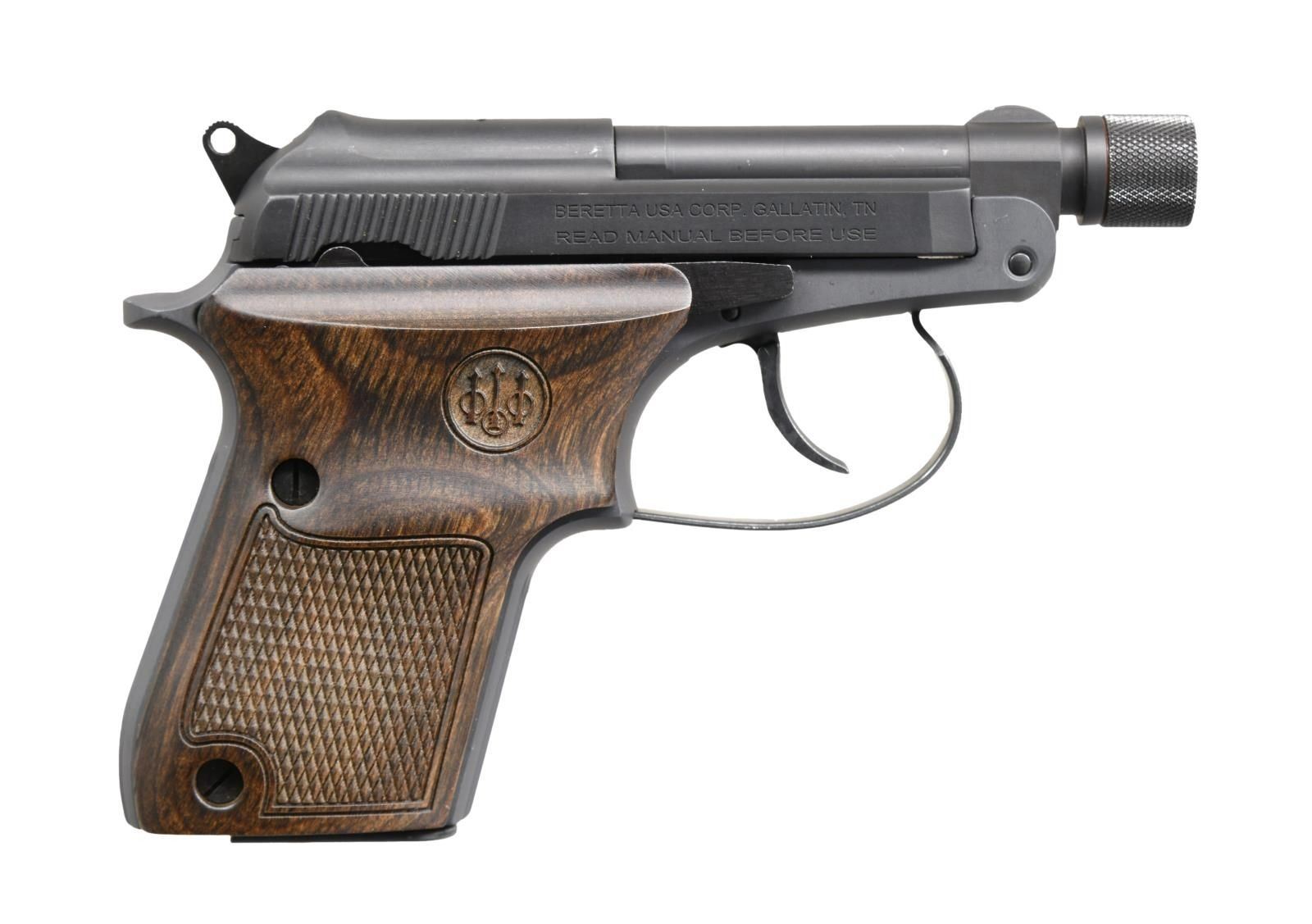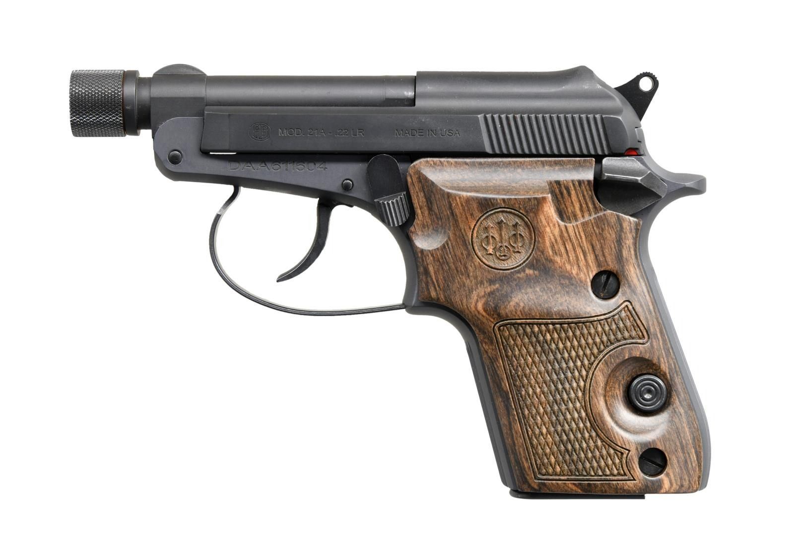Cal. 22 LR. S# DAA611604. Bbl. 2 1/2" threaded w/ thread protector. Blade front sight. Low profile fixed rear sight. Matte gray finish. Checkered hardwood grips w/ Beretta logo. MAGS: 1-7 rd. UNATTACHED ACCESSORIES: w/box. CONDITION: all aspects near excellent. PROVENANCE: The Collection of Gun Sport Ltd owned by Jon R. Thomas. (23-4300/MJC). MODERN. $350-500.