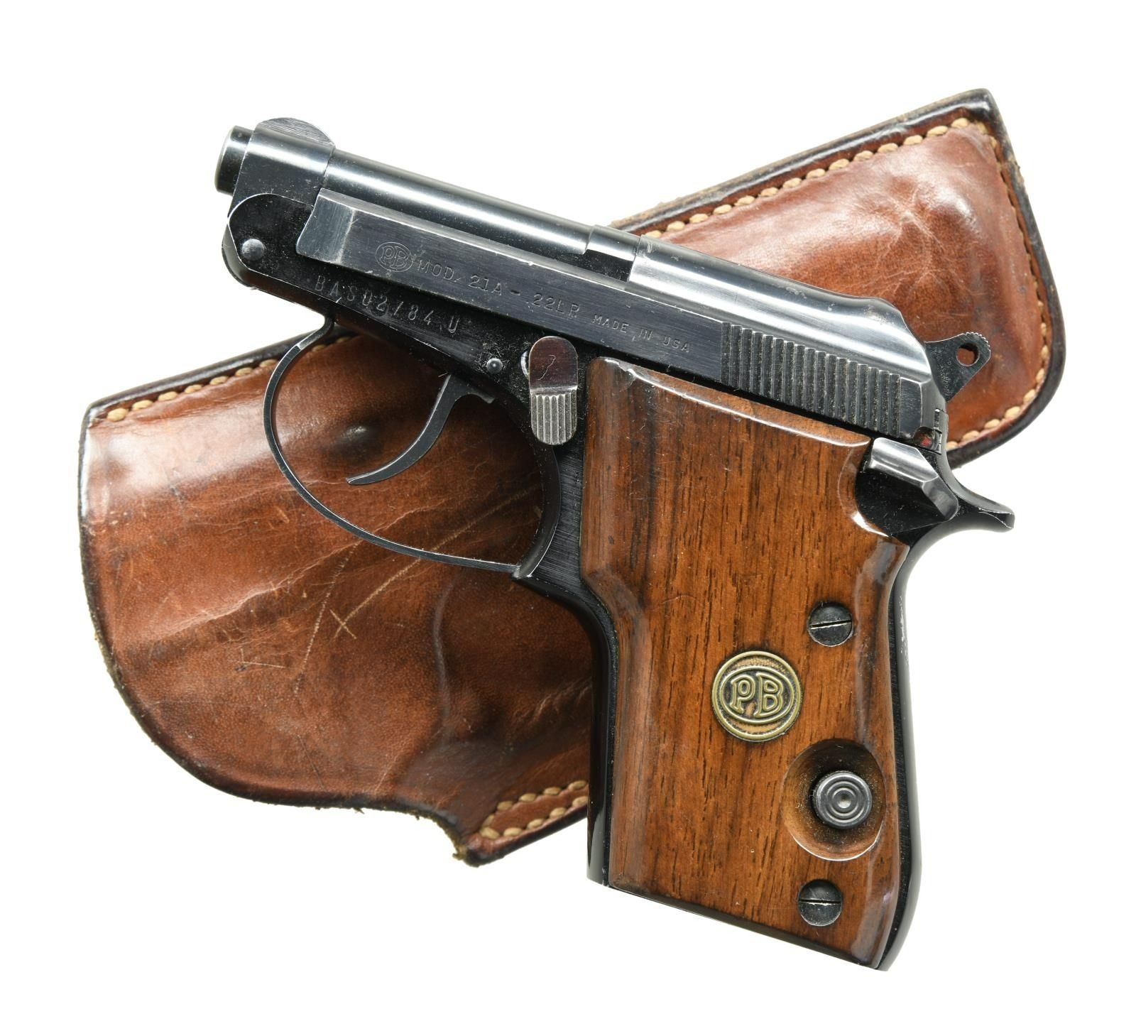 Cal. 22 LR. S# BAS02784U. Bbl. 2 1/2". Round blade front sight. Fixed rear sight. Blue & anodized finishes. Smooth hardwood grips w/ PB logo. MAGS: none present. UNATTACHED ACCESSORIES: right hand Safariland holster. CONDITION: right grip panel has a notable crack at top rear. Grips otherwise show some flaking varnish, dings, scratches & handling wear. Metal retains 85% original finish w/ scattered edge wear & scattered flaking. Very good bore. Provenance: From the Estate of Harry Henry. (23-5113/MJC). MODERN. $200-300.