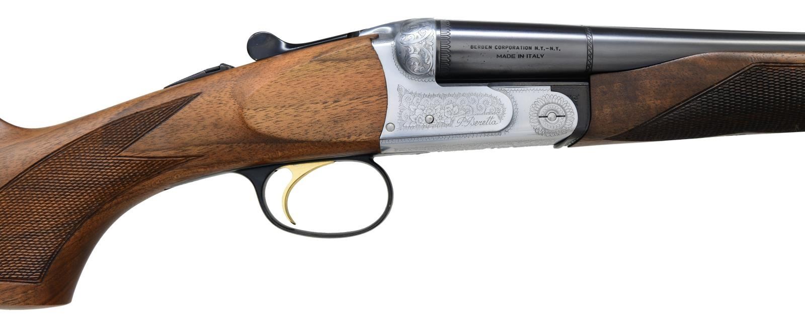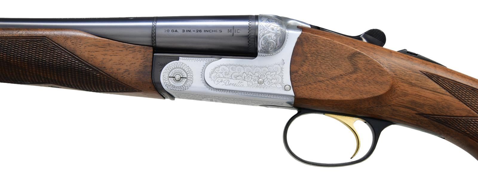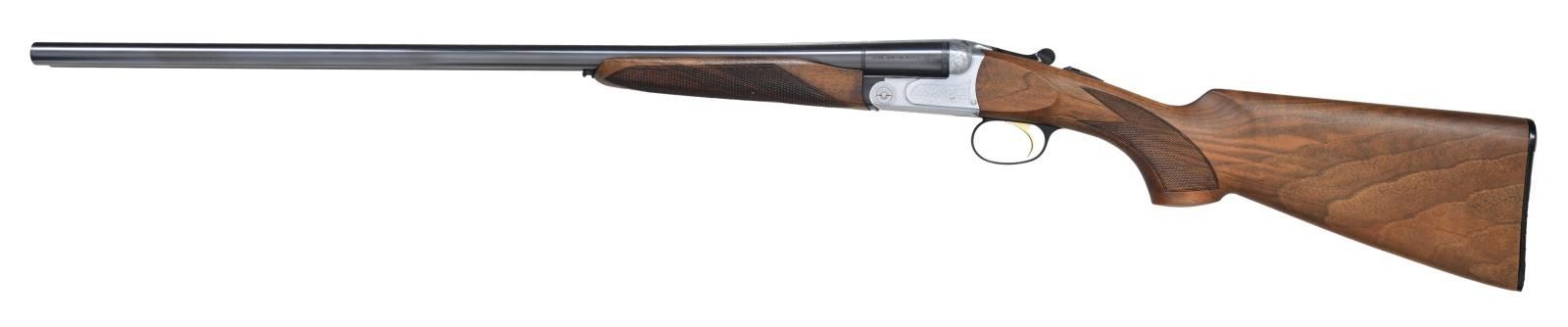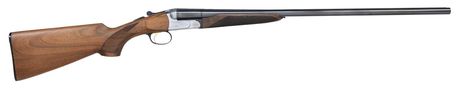 Cal. 20 ga. 3" chamber. S# A35034A. Bbls. 26 3/8" chrome lined of excelsior steel. Steel bead. Satin finished boxlock action w/ scroll ornamentation. Top lever has silver pigeon inlay. Gold finished single selective trigger. Selective ejectors. Trim beavertail forearm & satin finished pistol grip walnut stock w/ cut checkering. LOP: 14 1/8" over original buttplate. DAC: 1 1/2". DAH: 2 1/4". Choke constriction: R .010 L .019. Minimum wall thickness: R .034 L .034. WEIGHT: 6 lbs, 1.2 oz. UNATTACHED ACCESSORIES: Remington marked nylon gun case. 2 Armsport snap caps. CONDITION: excellent retaining over 98% wood & metal finish. Bright excellent bores. Appears unfired. (24-1521/DS). CURIO. $1,500-2,000.