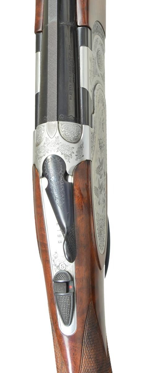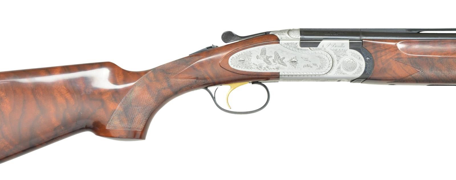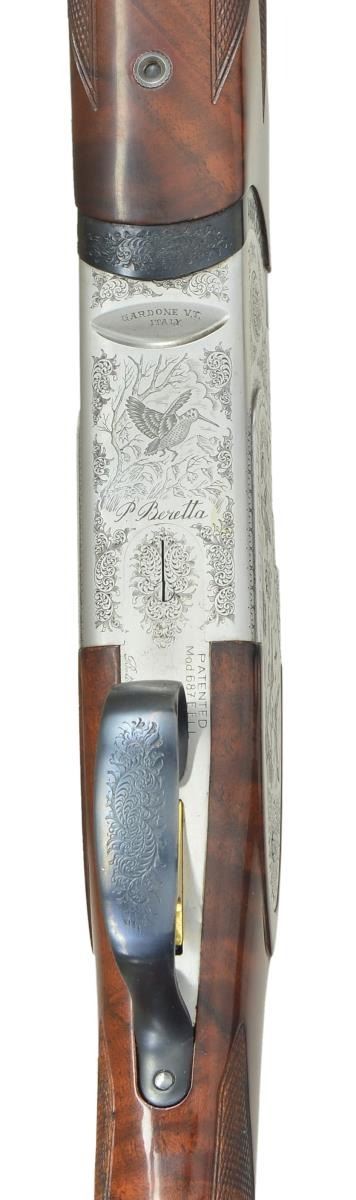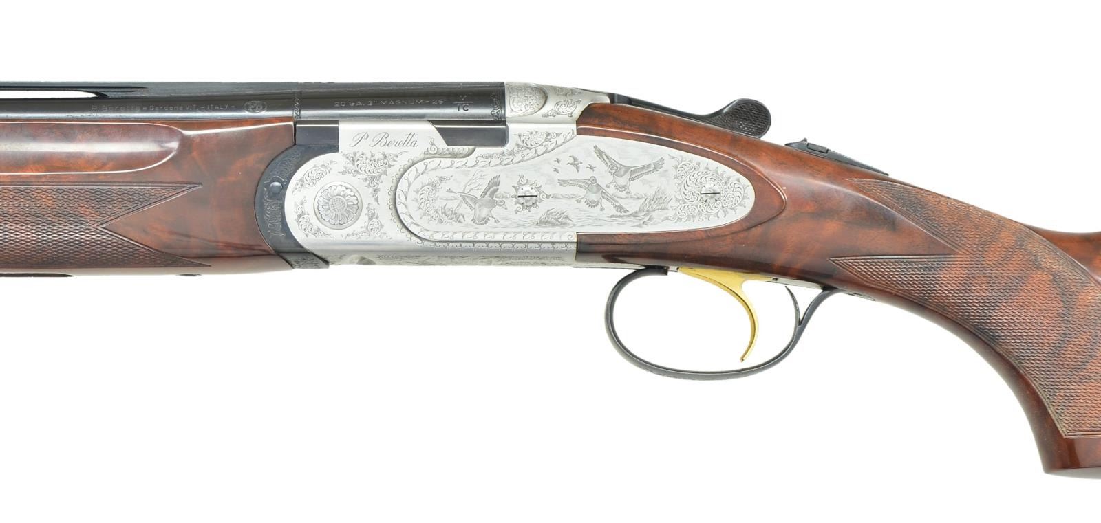 Cal. 20 Ga., 3". S# F29219B. Bbl. 26” vent rib w/ steel bead. Fixed IC & Mod chokes. Satin finished sideplated box lock action. Engraving features flying prarie chickens on the right lock plate, flying mallards on the left sideplate w/ a woodcock on the floorplate. Seams are highlighted by wedges of arabesque scroll. Gold finished SST & selected ejectors. Trim beavertail forearm & uncapped pistol grip stock of fancy walnut have gloss finish, cut checkering & oval nameplate in toe line. LOP: 14 5/8" over original Beretta pad. WEIGHT: 5lb., 13.2oz. UNATTACHED ACCESSORIES: Beretta blue molded case containing case instructions. CONDITION: near excellent retaining virtually all wood & metal finish. Buttplate shows heat distortion at heel & toe. Bright near excellent bores. (22-5951/DS). MODERN. $3,500-5,000.