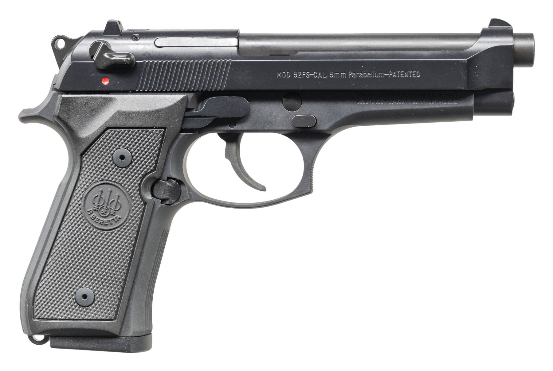Cal. 9x19. S# BER493075. Bbl. 5". Three dot sights. Maryland made Beretta 92 FS pistol. Ambi safety that also acts as a decocker. Matte black finish. Checkered black grips with Beretta monograms. MAGS: 2-10 rd. "PB" marked. UNATTACHED ACCESSORIES: unnumbered factory hardcase with manual & mag loader. CONDITION: all aspects near excellent including bore. (25-6264/MJC). MODERN. $300-500.