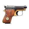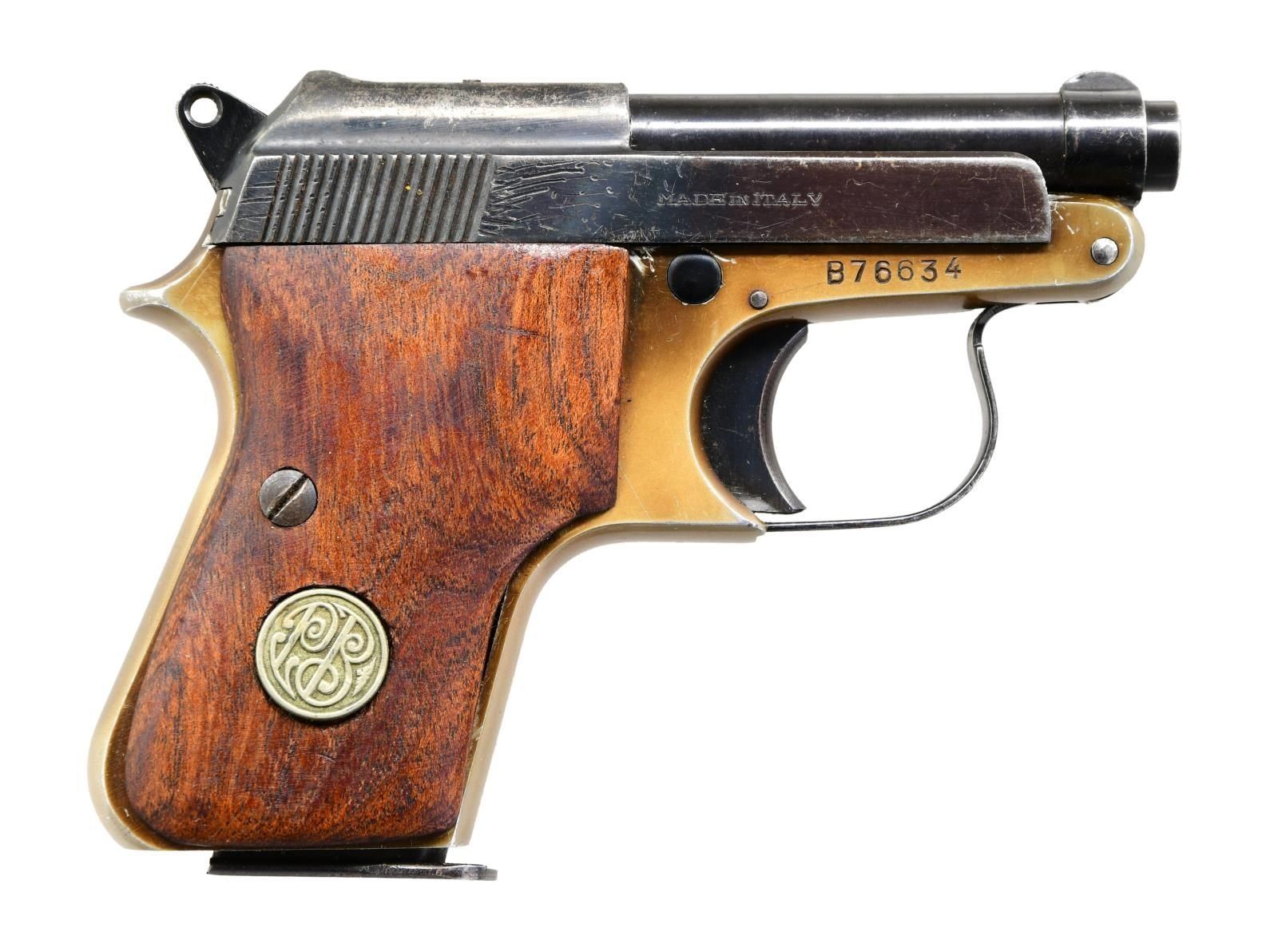 Cal. 25 ACP. S# B76634. Bbl. 2 1/2". Blade front sight. V-notch rear sight. Blued slide. Frame has a gold finish with a 1956 date at the left rear. Smooth hardwood grips with silver PB medallions. MAGS: 1-8 rd. CONDITION: grips show some chipping and handling wear. Frame has a yellow patina with some light dings and oxidation staining. Blued parts retain 60% blue with scattered scratches, edge wear, and dings. Very good bore. (24-2373/MJC). CURIO. $150-350.