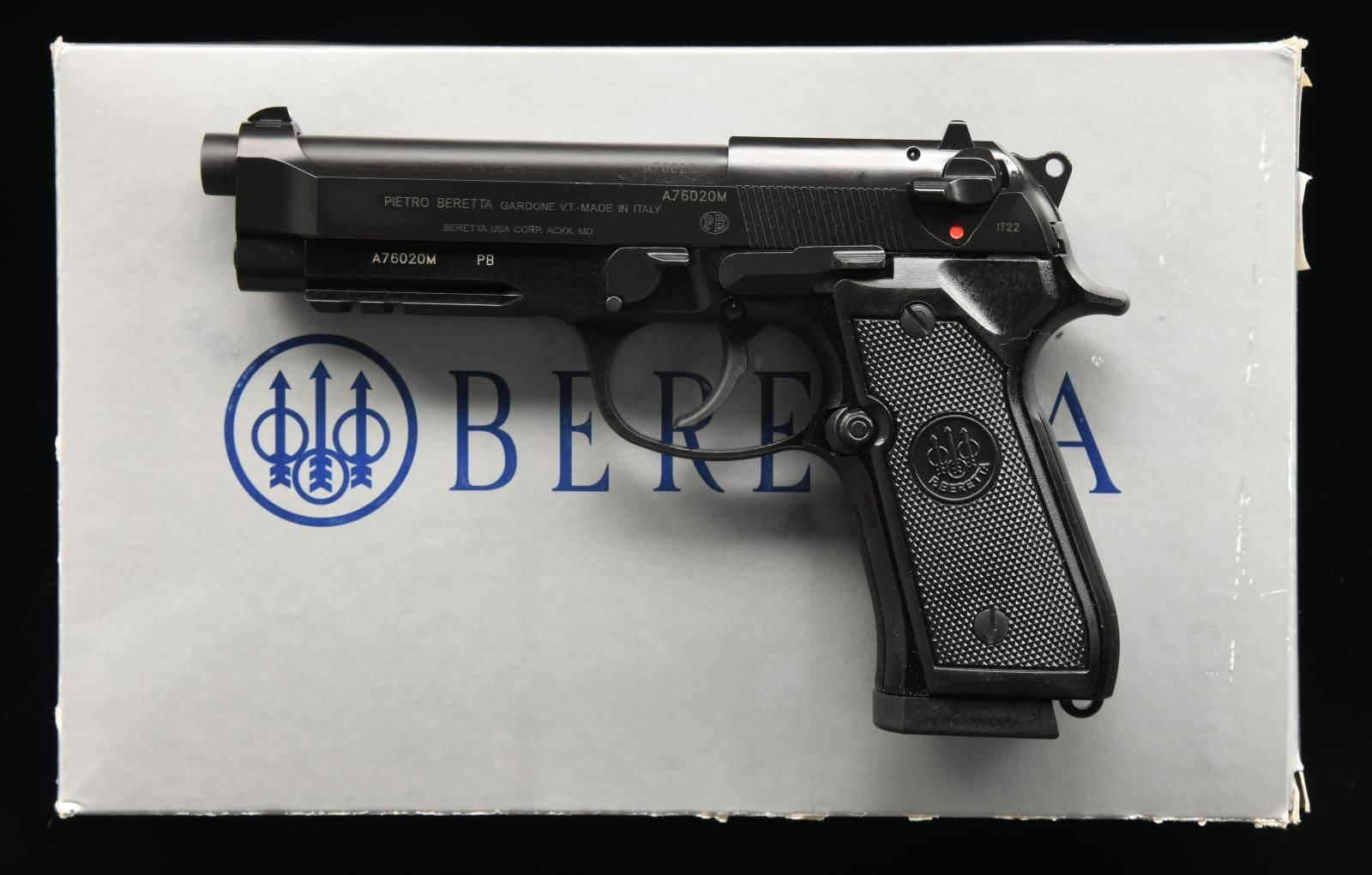 Cal. 40 S&W. S# A76020M. Bbl. 5". White three dot sights. Ambi safety that also acts as a decocker. Matte black finish. Frame has picatinny rail for accessory rail. Checkered black grips w/ Beretta logo. MAGS: 1-12 rd. UNATTACHED ACCESSORIES: w/box. CONDITION: all aspects near excellent. PROVENANCE: The Collection of Gun Sport Ltd owned by Jon R. Thomas. (23-4113/MJC). MODERN. $400-600.