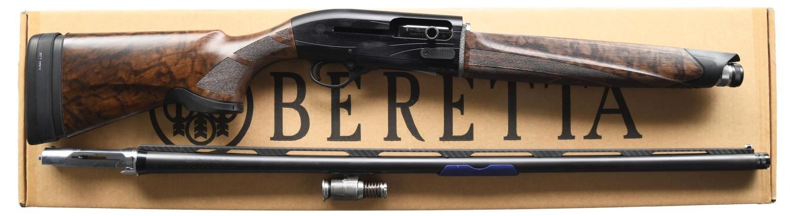 Cal. 12 ga. 3". S# XA260712. Bbl. 32" vent rib w/ Optimachoke interchangeable tubes. Set of 3 extended tubes included. 4 Shot mag. satin gray alloy receiver w/ blue finished bolt. Extended action release & bolt handle. Forearm & pistol grip stock w/ Kick-Off recoil system of extra grain wood w/ oil finish & pressed checkering. LOP: 14 1/4" over Micro-Core pad. WEIGHT: 7 lbs, 11.4 oz. UNATTACHED ACCESSORIES: original box containing spare chokes, wrench, oil & owner's manual. CONDITION: as new w/ box. PROVENANCE: from The Collection of Gun Sport Ltd owned by Jon R. Thomas. (23-3398/DS). MODERN. $1,400-1,800.