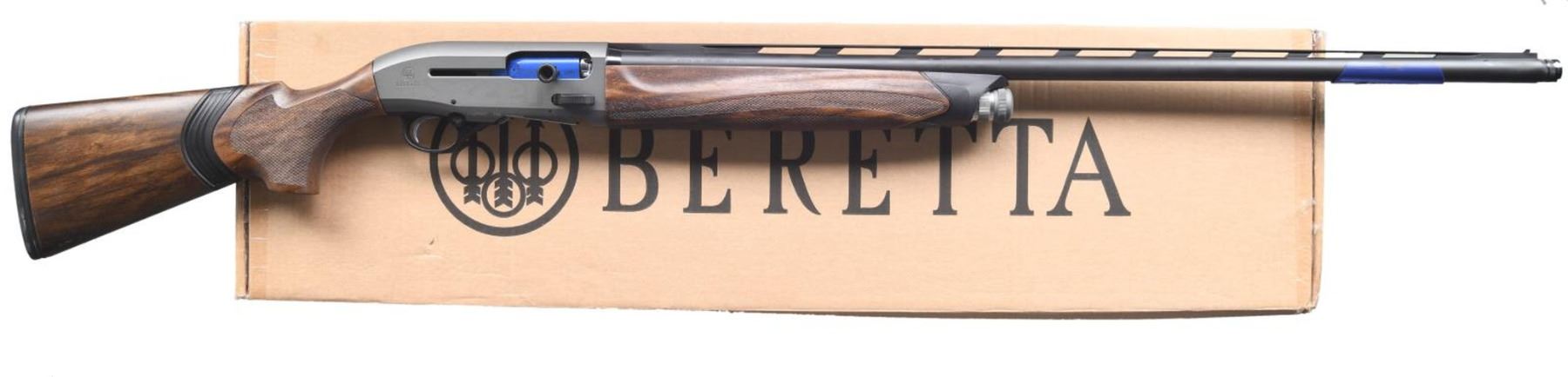 Cal. 12 ga. 3". S# XA270557. Bbl. 32" vent rib w/ Optimachoke interchangeable tubes. Set of 3 extended tubes included. 4 Shot mag. Satin gray alloy receiver w/ blue finished bolt. Extended action release & bolt handle. Forearm & pistol grip stock w/ Kick-Off recoil system of extra grain wood w/ oil finish & pressed checkering. LOP: 14 1/4" over Micro-Core pad. WEIGHT: 7 lbs, 11.4 oz. UNATTACHED ACCESSORIES: original box containing spare chokes, wrench, oil & owner's manual. CONDITION: as new w/ box. PROVENANCE: from The Collection of Gun Sport Ltd owned by Jon R. Thomas. (23-3395/DS). MODERN. $1,400-1,800.