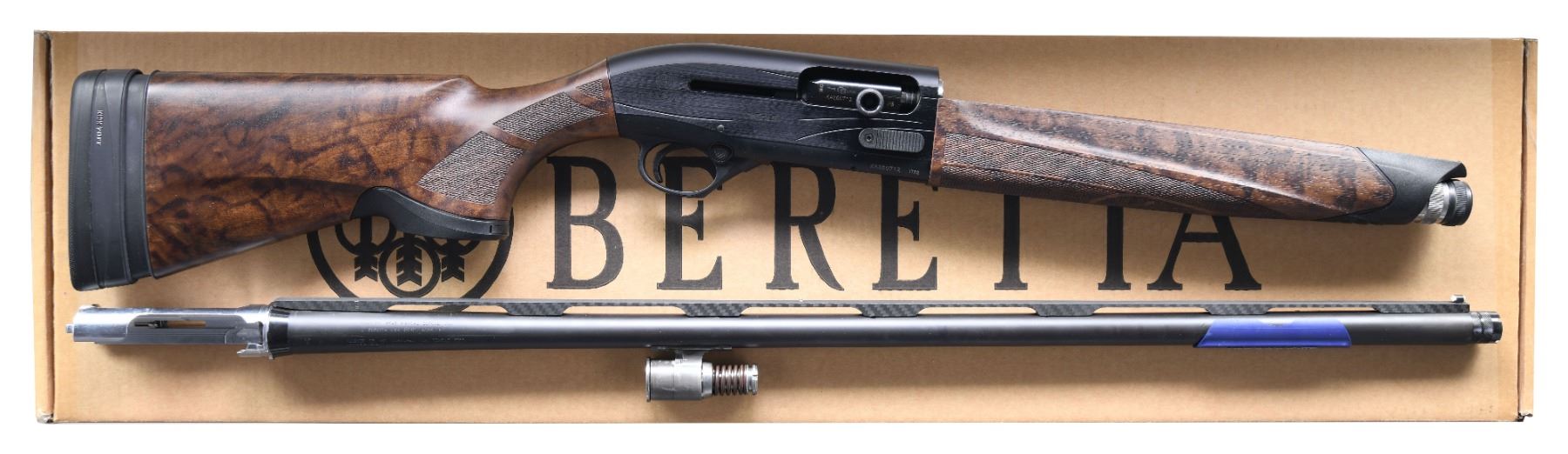 Cal. 12 ga. 3". S# XA260712. Bbl. 32" vent rib w/ Optimachoke interchangeable tubes. Set of 3 extended tubes included. 4 Shot mag. satin gray alloy receiver w/ blue finished bolt. Extended action release & bolt handle. Forearm & pistol grip stock w/ Kick-Off recoil system of extra grain wood w/ oil finish & pressed checkering. LOP: 14 1/4" over Micro-Core pad. WEIGHT: 7 lbs, 11.4 oz. UNATTACHED ACCESSORIES: original box containing spare chokes, wrench, oil & owner's manual. CONDITION: as new w/ box. PROVENANCE: from The Ex-Collection of Gun Sport Ltd owned by Jon R. Thomas. (24-6385/DS). MODERN. $1,400-1,800.