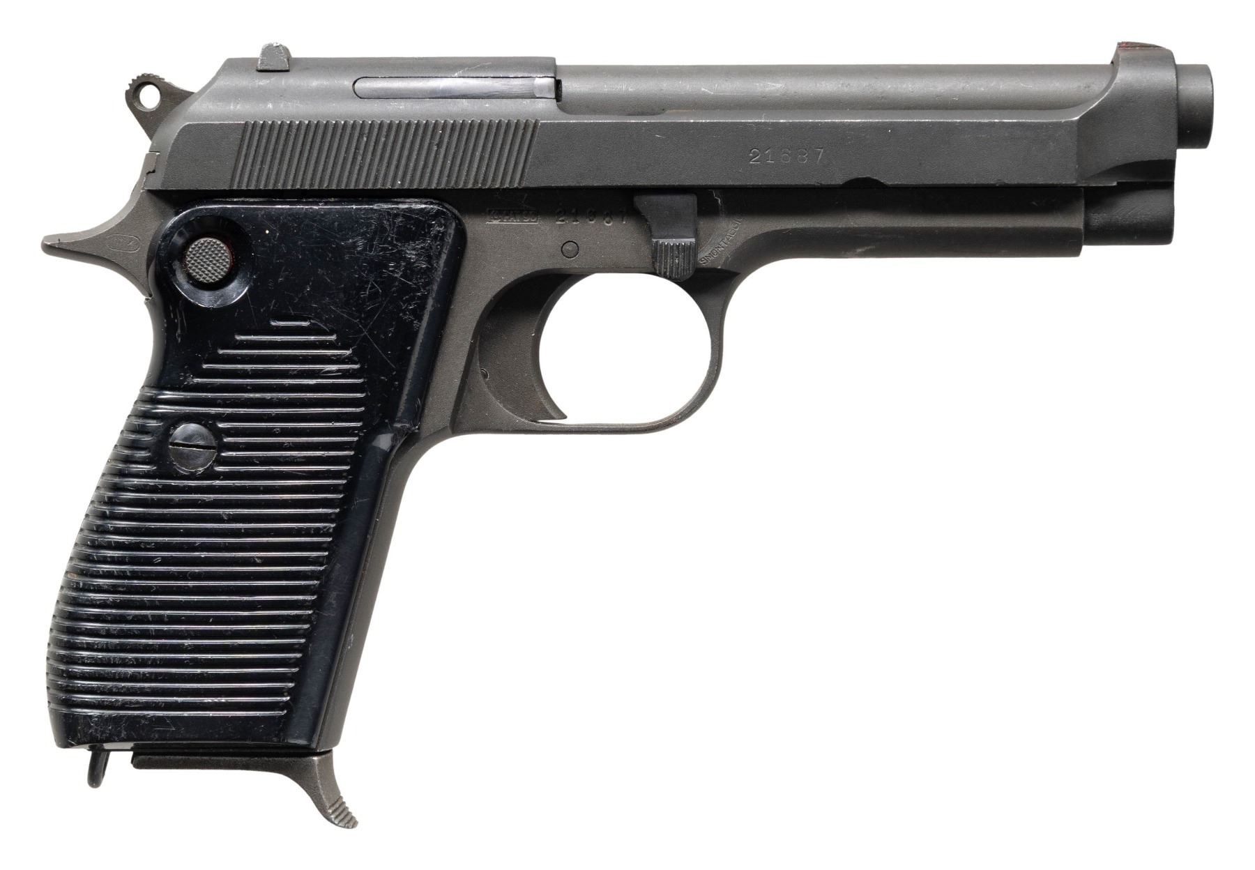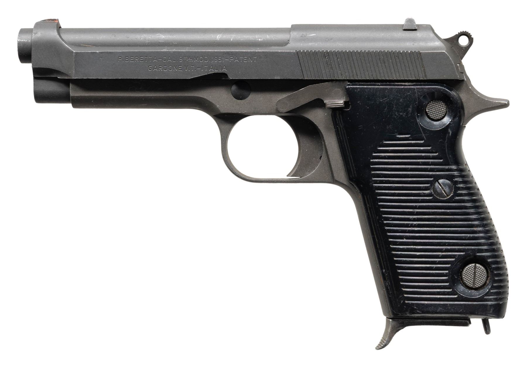 Cal. 9mm Luger. S# 21687. Bbl. 4 1/2". Standard Beretta 1951 sights. Matching numbers on slide & frame. Right side of frame has boxed "FAT96" Terni arsenal stamp. Underside of trigger guard has PW Arms import marking. Parkerized finish. Grooved black grips. MAGS: 1-8 rd. UNATTACHED ACCESSORIES: Cytac MPS holster. CONDITION: grips show scattered dings, scratches& handling marks. Metal retains 85% arsenal reparkerized finish with scattered edge wear, light scratches & light oxidation. Action functions properly when hand cycled. Very good bright bore. (25-5294/MJC). MODERN. $350-550.