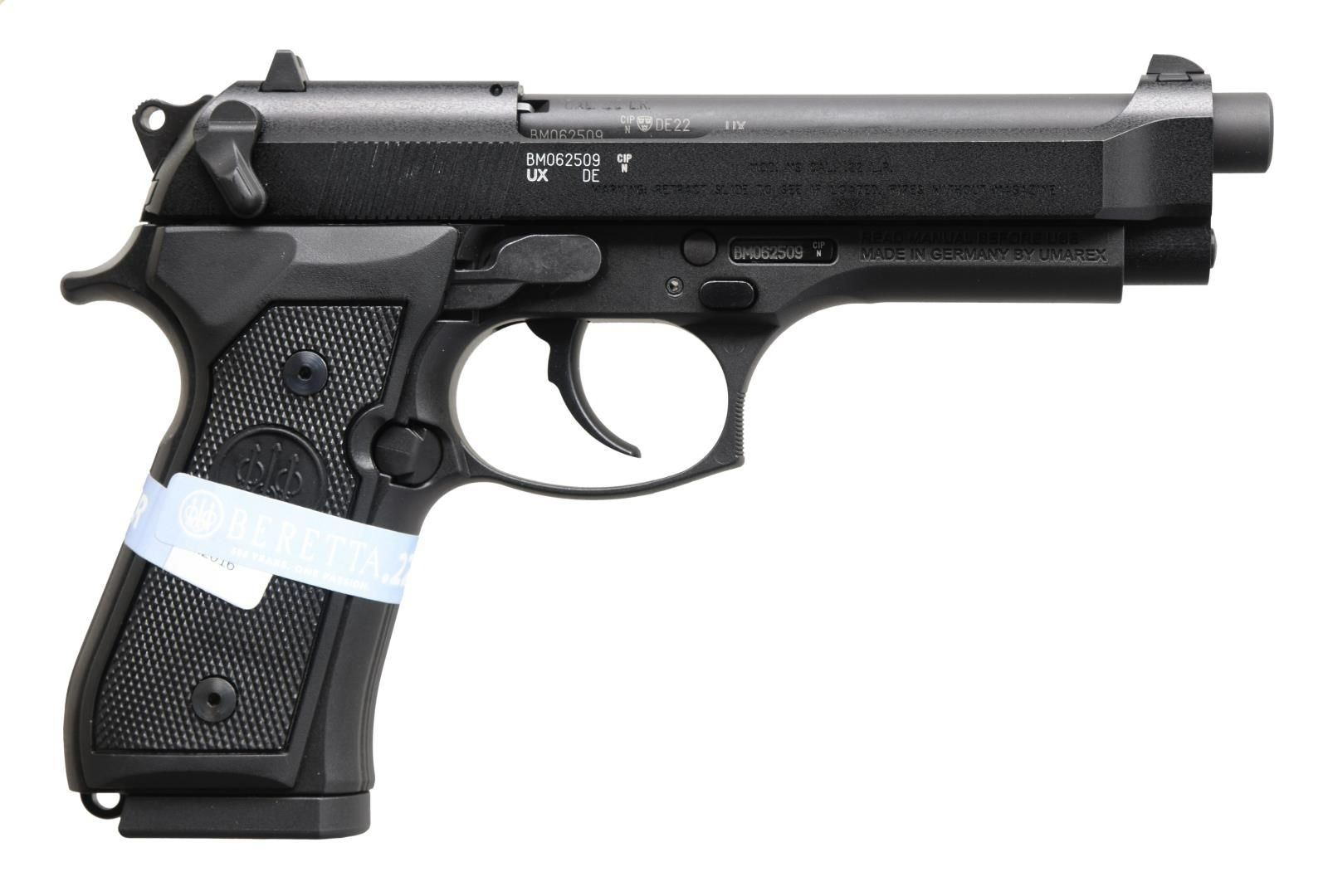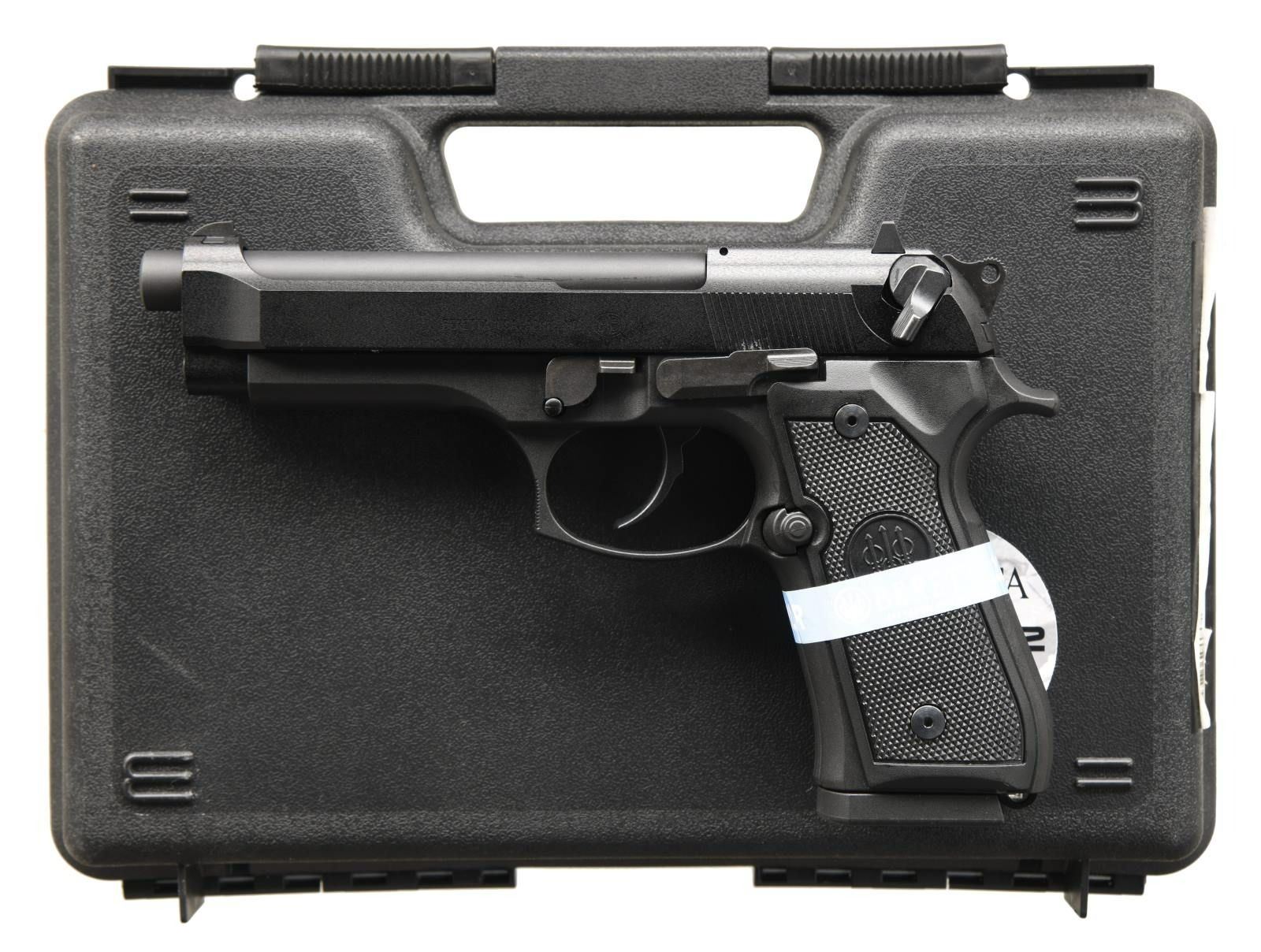 Cal. 22 LR. S# BM062509. Bbl. 5". Three dot sights. Rimfire Beretta M9 made in Germany under Beretta license. Ambi safety that also acts as a decocker. Matte black finish. Checkered black grips w/ Beretta logo. MAGS: 1-15 rd. UNATTACHED ACCESSORIES: matching numbered factory hardcase w/ foam inserts, cable lock, manual & paperwork. CONDITION: all aspects near excellent. PROVENANCE: The Collection of Gun Sport Ltd owned by Jon R. Thomas. (23-2751/MJC). MODERN. $300-400.