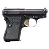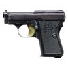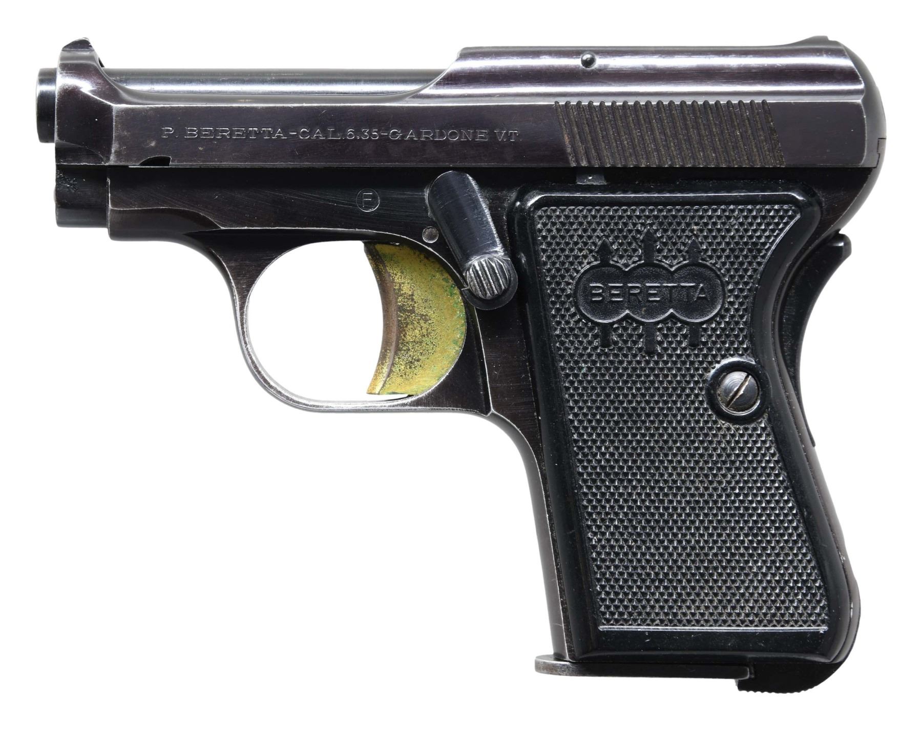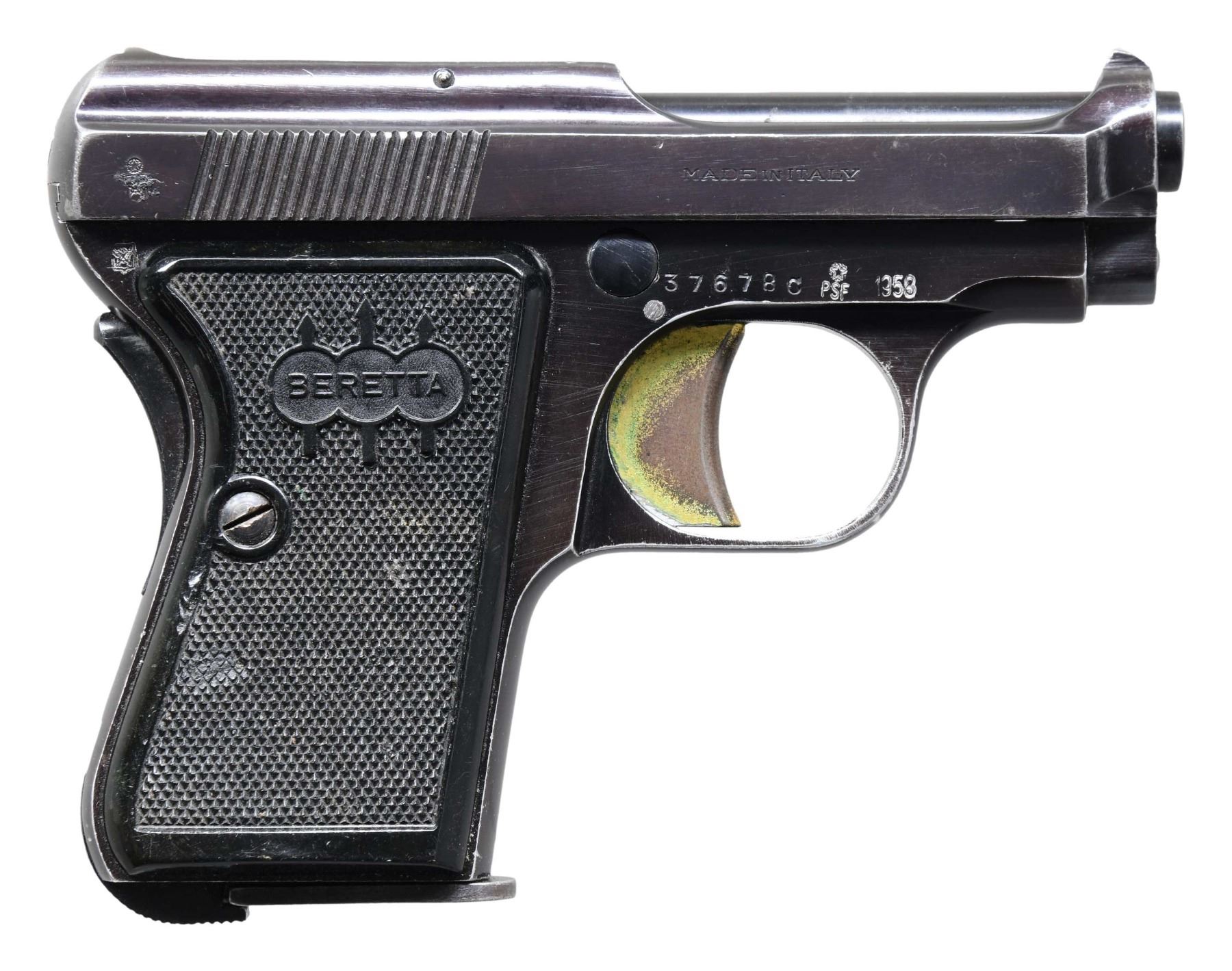 Cal. 25 ACP. S# 37678C. Bbl. 2 3/8". Blade front sight. V-notch rear sight. 1958 made Beretta 418 pistol. Blued finish with gold plated trigger. Checkered black grips with Beretta logos. MAGS: 1-7 rd. blued. CONDITION: grips show some flattened checkering & handling marks. Trigger retains a strong amount of gold plating with scattered oxidation staining. Balance of metal retains 92% original blue with frame turning plum, some edge wear & a few small spots of light oxidation. Action functions properly when hand cycled. Very good + bright bore with strong rifling. (25-2075/MJC). CURIO. $800-1200.