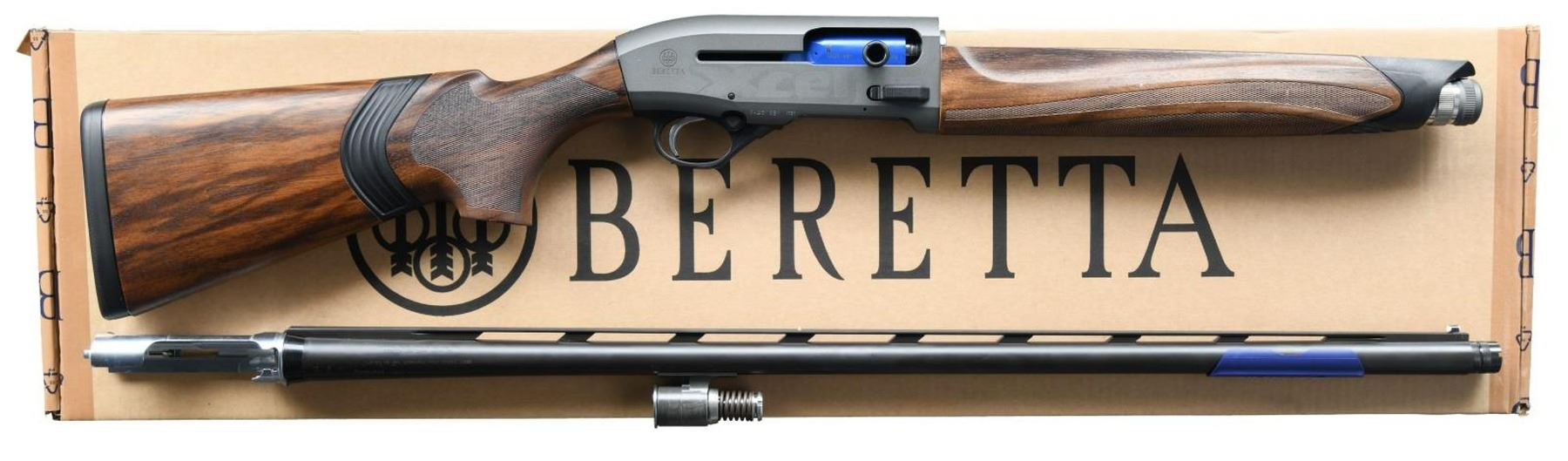 WITH MATCHING FACTORY BOX. Cal. 12 GA, 2 3/4" or 3". S# XA251681. Bbl 30". Model A400 Xcel semi-automatic shotgun manufactured by Beretta in Italy and imported by Beretta USA Corp. The left side of the bbl. is marked "SPORTING" above Beretta's manufacturer information and the cal. designation, with Beretta USA Corp.'s importer information on the right. Receiver exhibits a stylized "Xcel" followed by the model designation on the left, with Beretta's logo, another stylized "Xcel", and the S# on the right. Matte gray anodized receiver, with matte blued bbl. Checekered wood pistol grip buttstock, with checkered wood forend. High vent matte rib with white plastic bead front sight and removable Modified choke. UNATTACHED ACCESSORIES: matching factory box. CONDITION: near new, with metal components retaining virtually all their original factory applied finishes overall. Mirror bore. Wood furniture is excellent. Box shows some mild exterior wear from storage and handling, but otherwise remains sturdy and serviceable. PROVENANCE: The Collection of Gun Sport Ltd owned by Jon R. Thomas. (23-3527/MLW). MODERN. $1,800-2,500.