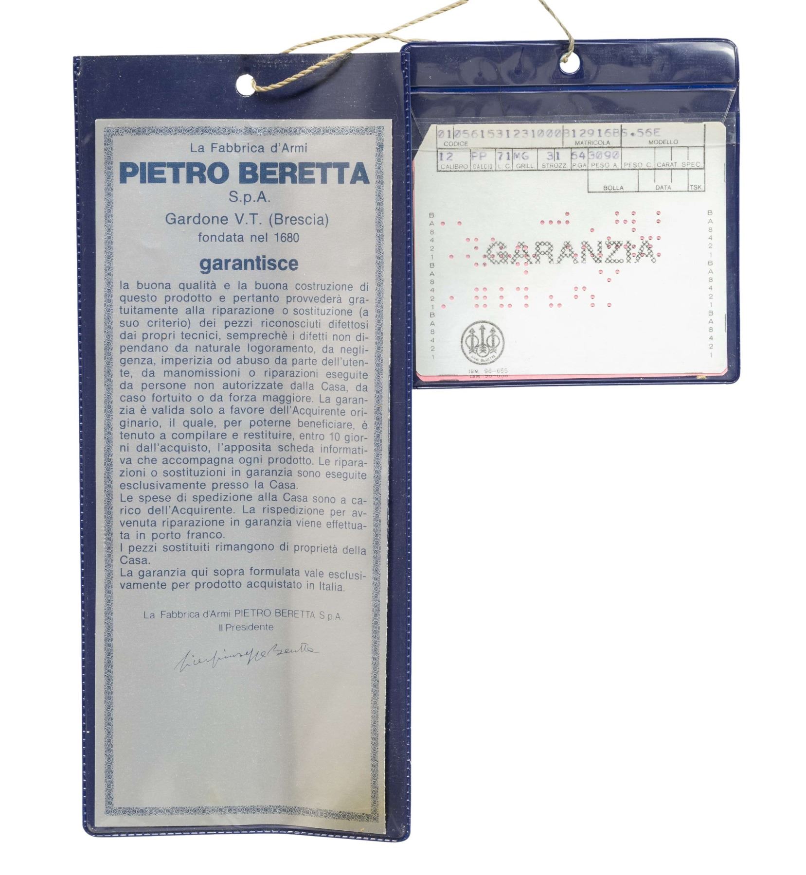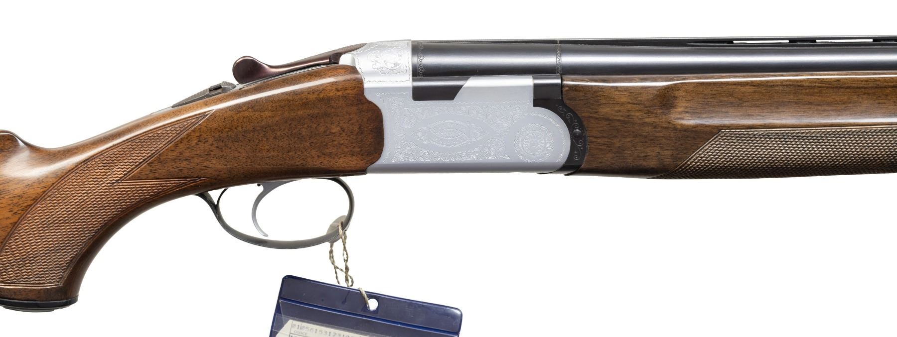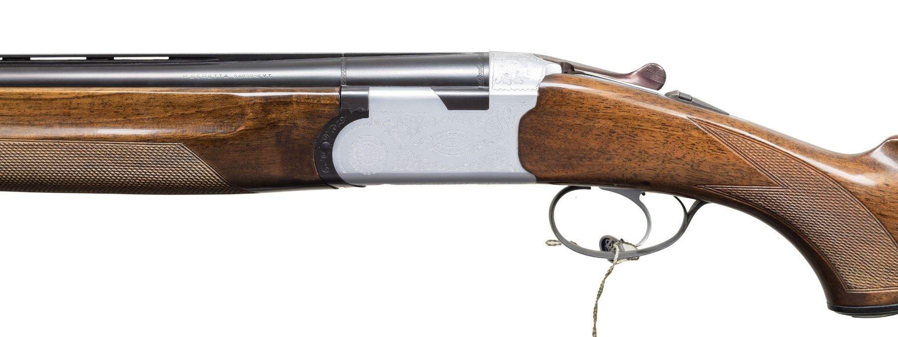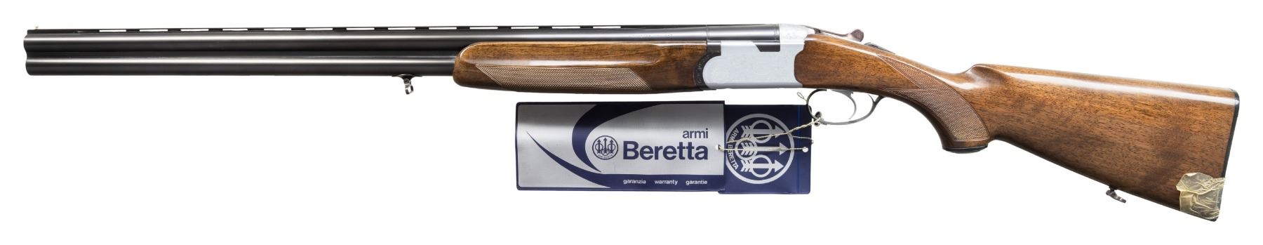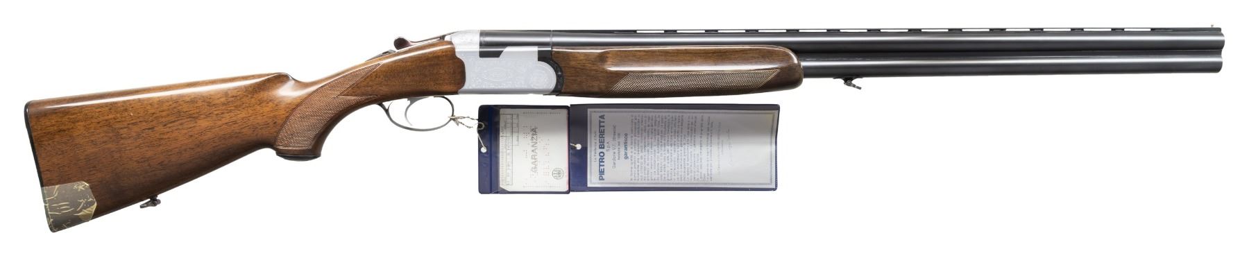 Cal. 12 Ga, 2 3/4". S# B12916B (AA = 1975). VR 28" barrels w/ steel bead; Full & IM measured fixed chokes. Silver finish engraved action w/ SST & ejectors. Checkered walnut stock set w/ black Beretta grip cap & buttplate. Toeline & barrel sling swivels. UNATTACHED ACCESSORIES: Beretta hang tags. Beretta factory box with brown leather sling. CONDITION: balance very good with light handling marks. Buttplate is broken at toe with bottom screw missing; held by tape. (25-5229/MD). CURIO. $700-1,000.