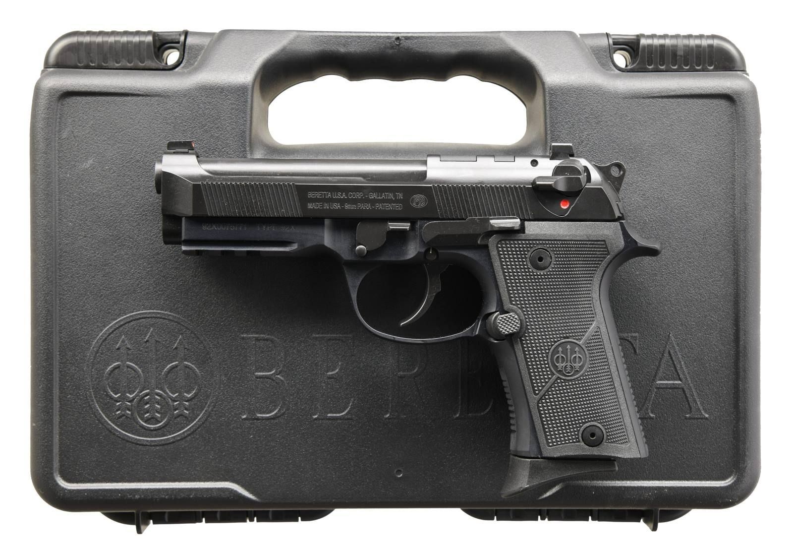 Cal. 9mm Para. S# 92X0075771. Bbl. 4 1/4". Red dot front sight. Black rear sight. Slide is cut for RMR plate. Compact Beretta 92 pistol. Frame has accessory rail. Checkered black grips w/ Beretta logo. MAGS: 2-15 rd. UNATTACHED ACCESSORIES: factory hardcase matching numbered to gun w/ cable lock, manual & paperwork. CONDITION: all aspects near excellent. PROVENANCE: The Collection of Gun Sport Ltd owned by Jon R. Thomas. (23-2752/MJC). MODERN. $450-600.