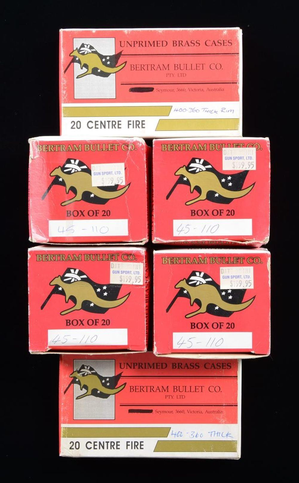 Grouping includes 4 boxes (80 pcs.) of 45-110. / 2 Boxes (40 pcs.) of 400-360 Thick Rim brass cases. CONDITION: all are in factory packaging, as new. PROVENANCE: the Collection of Gun Sport Ltd owned by Jon R. Thomas. (02-20854-7/JZ) $600-800.