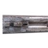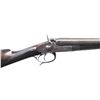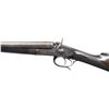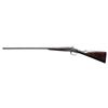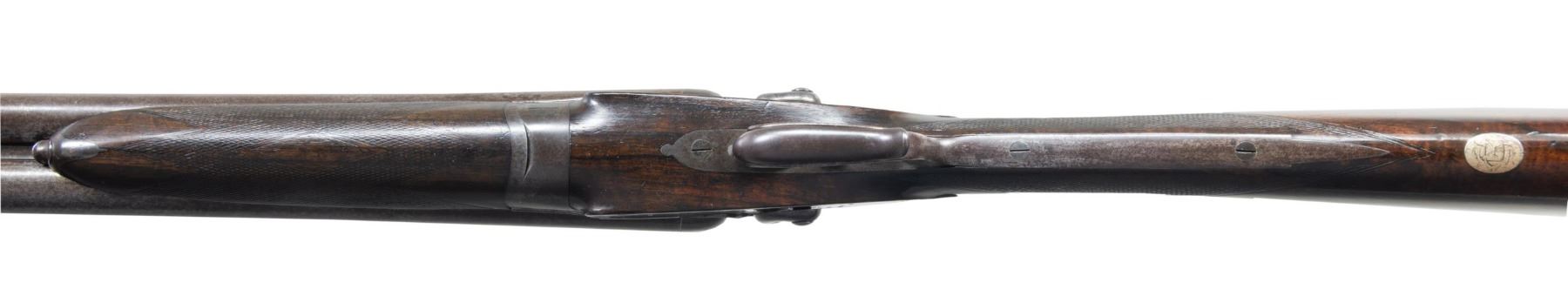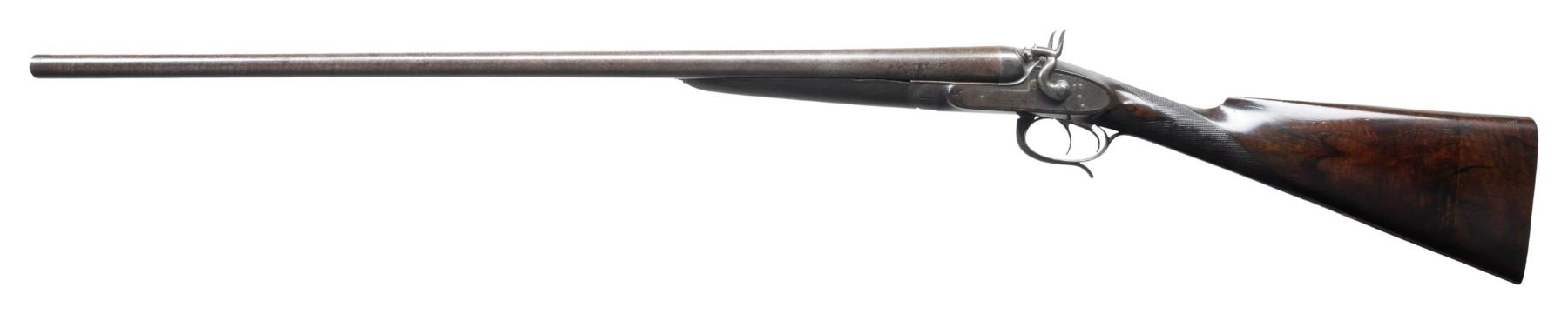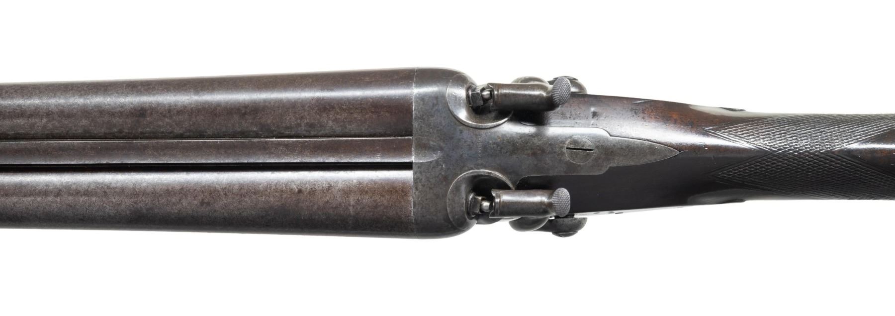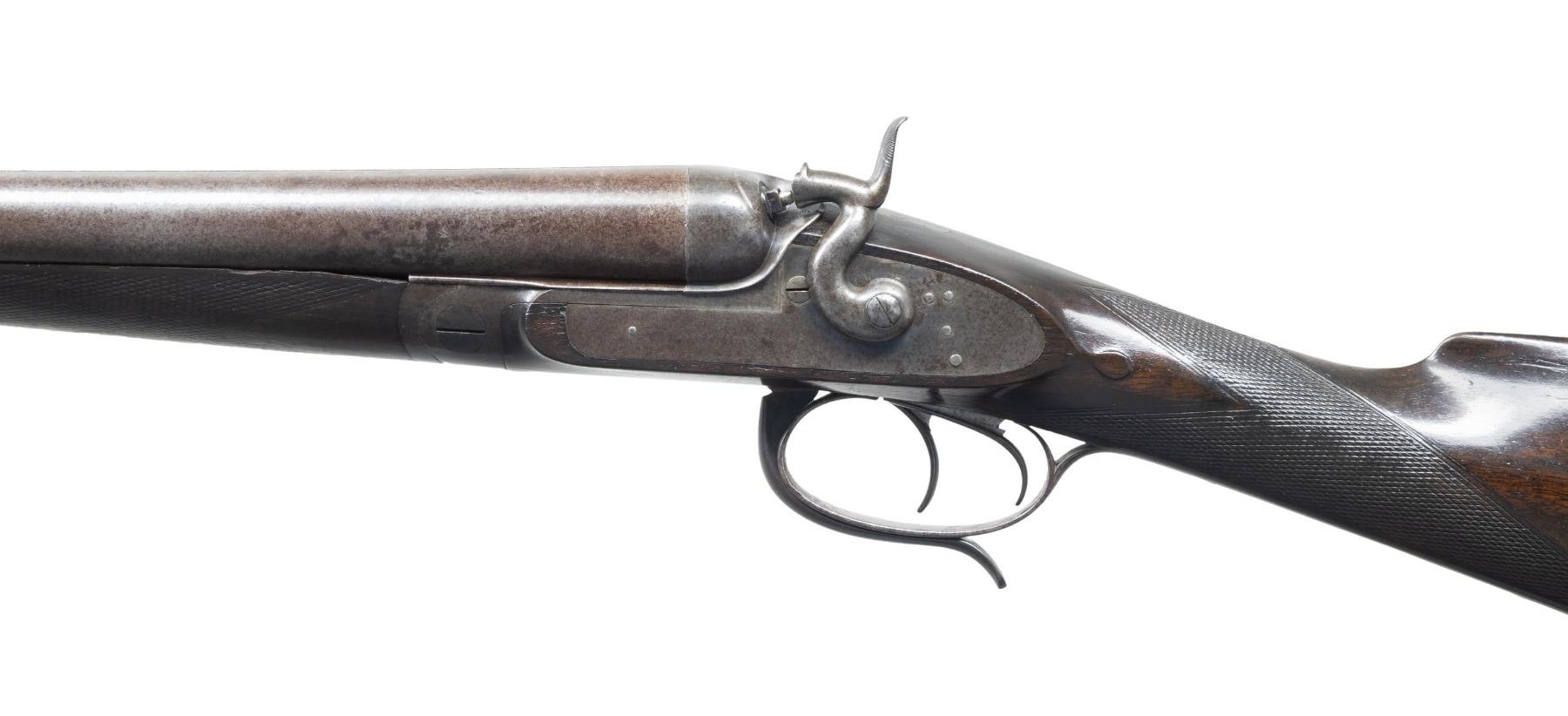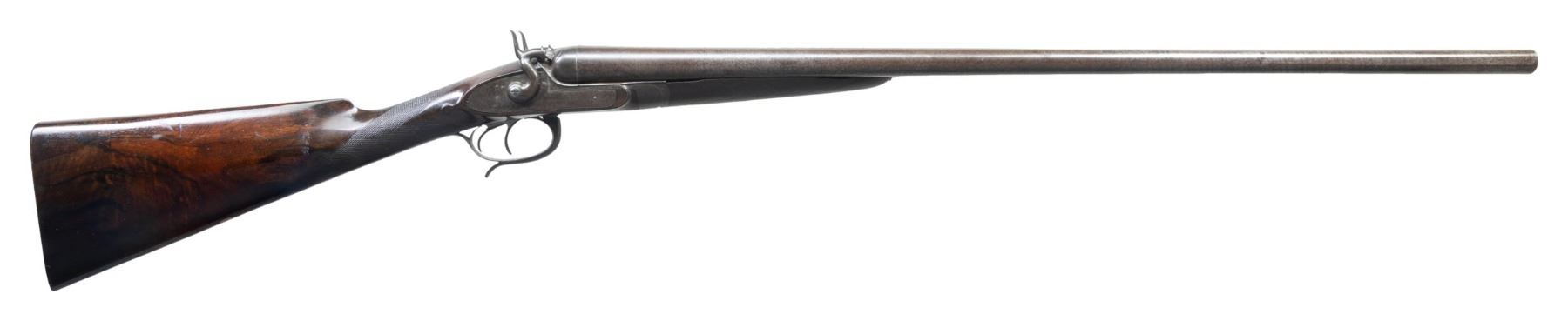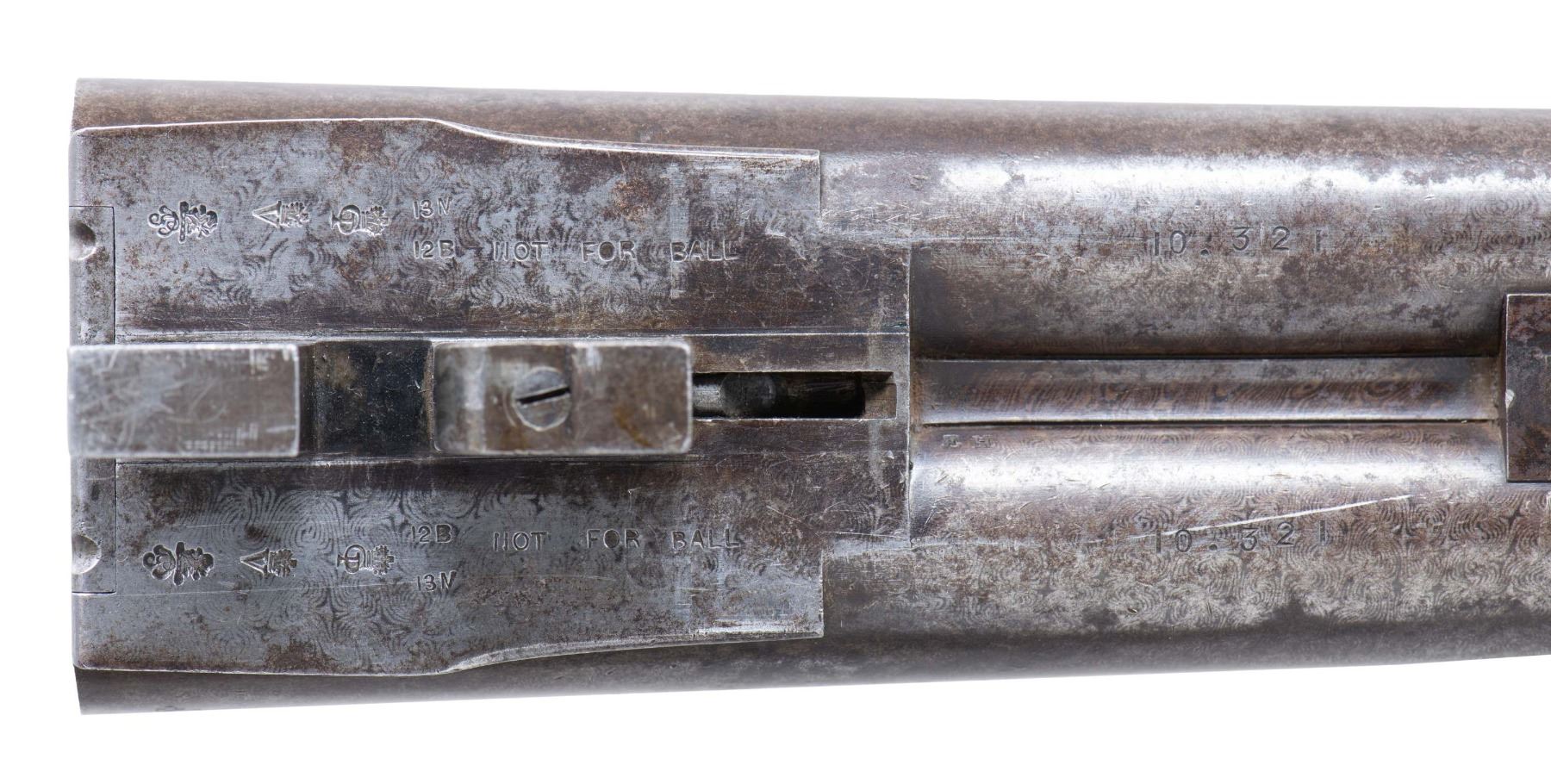 HAMMER GUN WITH SCARCE DAW LEVER ACTION. Cal. 12 Ga. 2-3/4". S# 10321. Many feel that the bar-in-wood hammer gun is the most elegant breechloading shotgun ever produced. Other people believe that the addition of engraving on a fine gun only hides the evidence of fine gunmaking. This best, plain finish gun has 30" three striped Damascus barrels engraved "J. Purdey & Sons 314 1/2 Oxford Street. London." on very narrow swamped game rib. Rear portion of rib is engraved "CHOKE". Barrel flats are stamped with London black powder proofs "NOT FOR BALL" and with chokes "12B 13M" both barrels. Chambers measure 2-3/4" and do not appear to have been lengthened. Bar-in-wood action has fences filed in best quality manner and is fitted with front spring locks having serpentine rebounding hammers. Action has Purdey type underbolts actuated by a lever over guard of a type the factory refers to as "Daw lever" which gives superior hand access compared to either the normal top lever or the, popular at the time, "thumb hole". Action, locks and hammers are unengraved except for maker's name on each lockplate and "Patent" on top. Trigger plate has ball finial and trigger guard is engraved with S# on tang. Bar-in-wood buttstock, so called because wood runs under lockplates almost all the way to the hinge pin covering most of the action bar (structural part connecting hinge and standing breech); made of well marbled and stump figured European walnut measures 14-7/8" over 2-3/4" lengthening piece fitted to the original curve of the stock (consignor states factory records indicate this gun was originally made with approx. 12-1/2" LOP). This lengthening piece is exceptionally well fitted and grain matches very well. Butt is correctly shaped and nicely checkered in correct Purdey fashion. Point pattern checkering is at grip and a silver oval on toeline is monogrammed "CFB" (?). Oval is set at the usual distance of approx. 3" from original toe of stock. Matching splinter forend has Anson release. MEASUREMENTS: BBLS: Bore Diameter: L .730. R .731. Restriction: L .027 (IMod). R .025 IMod). Wall thickness: L .024. R .026. STOCK: DAH: 2-3/16". DAC: 1-1/2". CAST: about 1/2" off. LOP: 14-7/8". WEIGHT: 7 lb. 7 oz. CONDITION: very good to fine. Barrels retaining most of their original brown with scattered light pin prick pitting mostly at carry point. Action and lockplates retain a good amount, perhaps 40% case hardening color, the remainder a smooth mottled brown. Trigger guard retains some original bright blue mostly where protected by lever. Stocks retain their original surfaces having added oil with addition of lengthening piece. Checkering shows considerable wear especially on forend. Bar-in-wood guns are notorious for stock problems especially around action; this example is exceptionally good without any noted cracks or other problems. Forend shows some minor chipping and loss of wood along edges. Bores are mostly bright and smooth with some minor pitting evident in right barrel toward breech end and dent removal also in right barrel about 14" from muzzle. Action is tight. Barrels on face. Locks are crisp. Screw slots show little use. This gun should make a great shooter. (01-27222/MGM). ANTIQUE. $5,000-8,000.