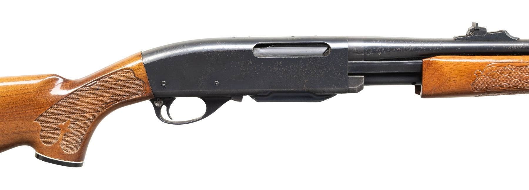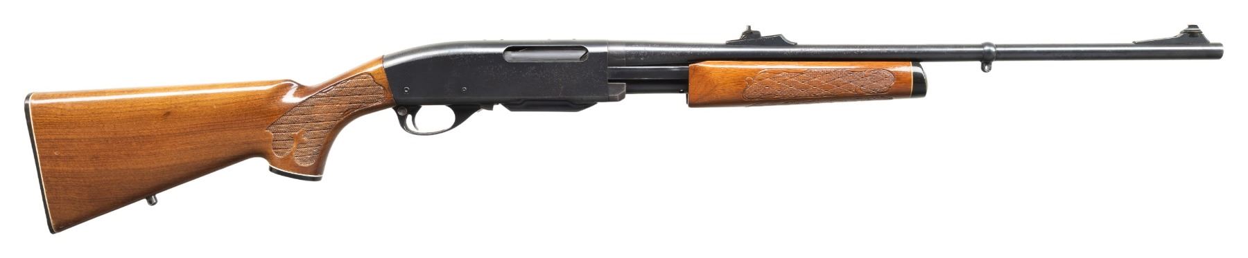 2) 760 PUMP. S# A7124285. Bbl. 22" w/ added sling stud; bbl. code "BI" indicates Jan. 1976 mfg. Replacement front sight & original rear sight with stripped windage screw. Pressed walnut stock set. MAGS: 1 - 3 rd. CONDITION: good blue with oxidation spots throughout. Very good wood finish with light wear. Very good rifling. PROVENANCE: From the PMRB Collection. (25-5847/MD). CURIO. $700-1,000.