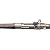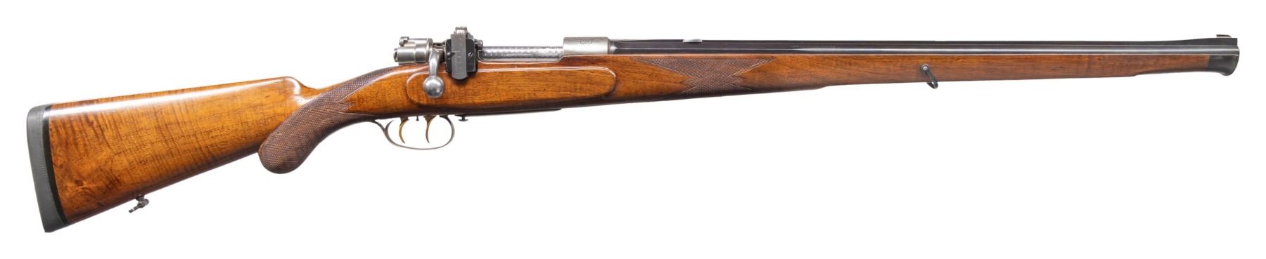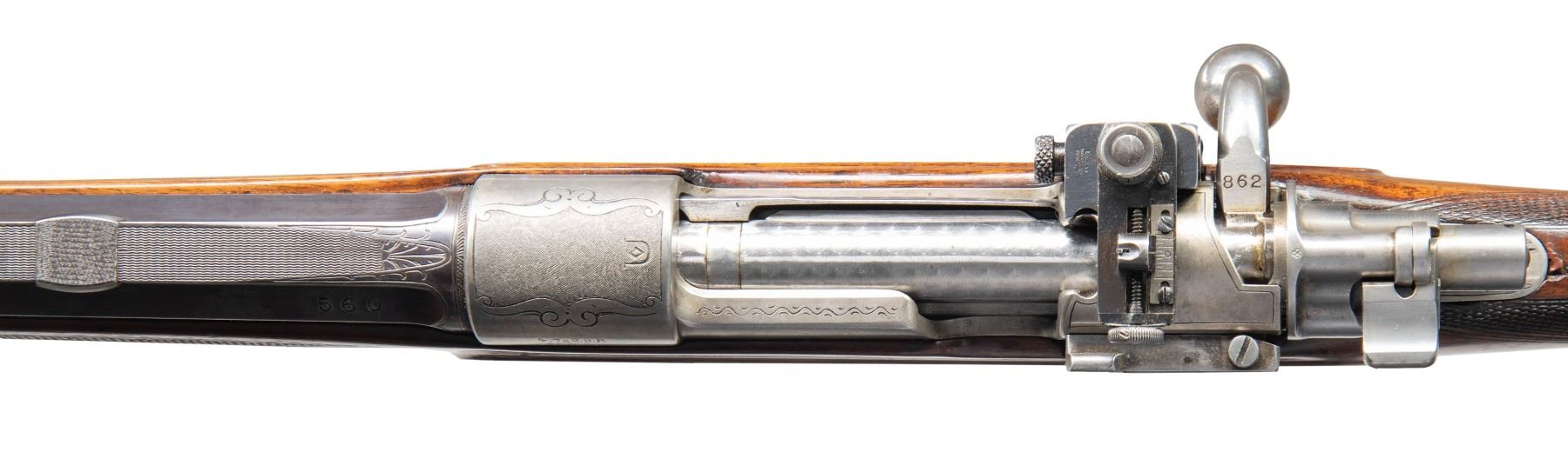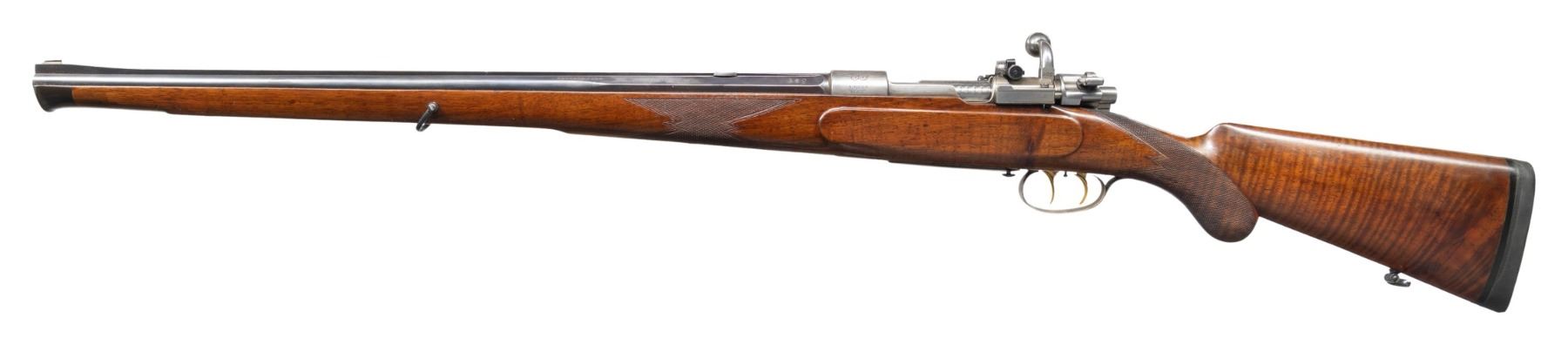 UTRECHT. Cal. 11.2X72 (Schuler ?). S# 862 (on bolt) 560 (on the barrel). The 24-1/2" one third octagon, 2/3 round ribbed barrel is engraved with maker's name and address on milled out portion of matting on rib. Rear sight dovetail is plugged. "560" is newly stamped at rear of top left flat. Case hardened (now French gray) model 98 Mauser action has been fitted with Lyman 48 rear sight. Bolt body has been engine turned. Bottom metal is fitted with gold plated double set triggers and floor plate altered to be removed with push button. Receiver ring is nicely stippled. Bottom metal has some scroll and line borders. Nicely fiddle figured round knob pistol grip stock extends to muzzle with schnabled horn tip and has raised side panels around action, point pattern checkering, sling bail and loop. Stock measures 14-1/2" over black "Old English" pad. CONDITION: very good to fine as partially refinished. Barrel retaining most of a re-blue with some subsequent high edge wear. Case color of action faded to silver gray; surfaces remaining smooth. Stocks with added oil over some old marks and dings; checkering lightly worn. Bore is very good to fine; mostly shiny, a bit dark in grooves. Mechanically fine. PROVENANCE: From the Buckstix Collection. (25-6374/MGM). CURIO. $3,500-5,500.