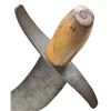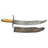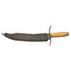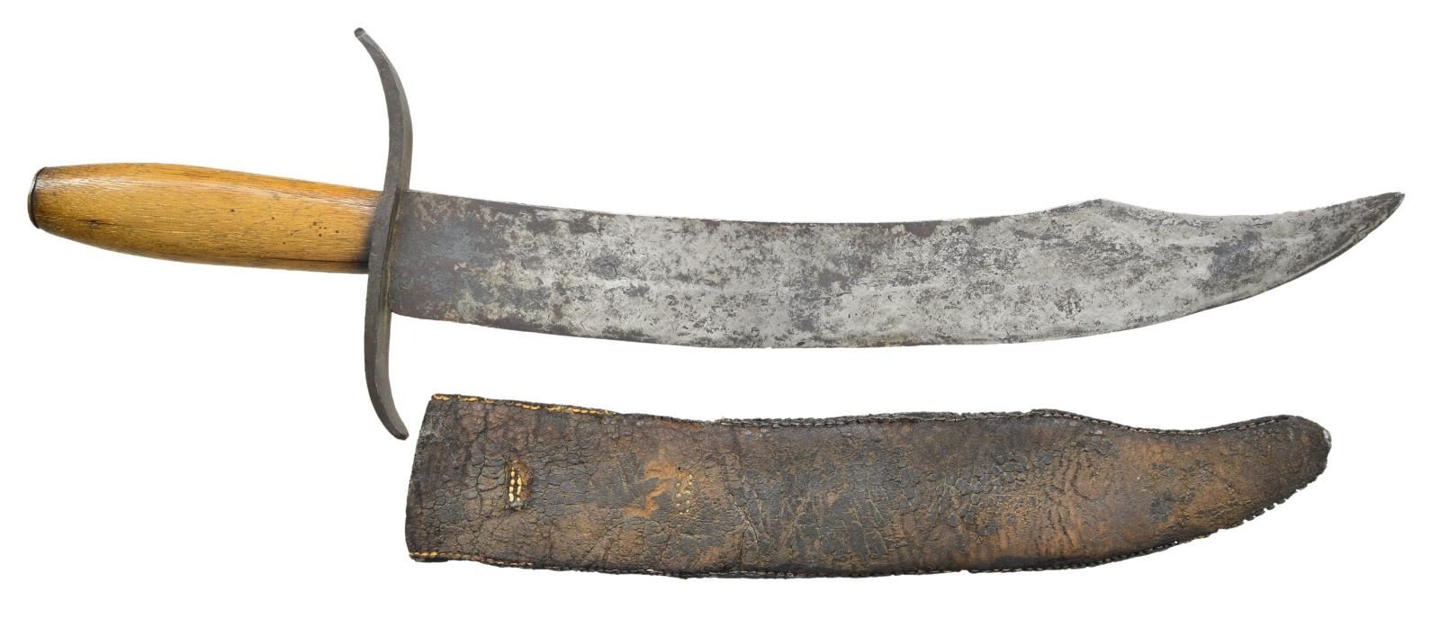 WITH ORIGINAL SHEATH. 20.25” overall, 15” wide upswept blade, 2” wide, 4.5” beveled clip, 6” “S” shaped crossguard, oval copper washer cap. This knife was part of the John Ashworth impeccable Confederate knife collection. CONDITION: very good overall, smooth iron patina, hand worn patina to grip with few hairlines. Sheath is poor but mostly intact dry, shrunk, & cracked, broken belt loop & tip, unsewn at edges. Sheath has inscription on one side but only few letters/numbers can be discerned now. PROVENANCE: pictured on page 244 of Confederate Bowie Knives and in Accoutrements IV, page 185 by Jim Johnston. (02-17777/JS). $3,500-5,500.