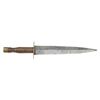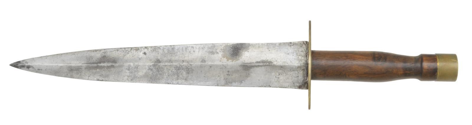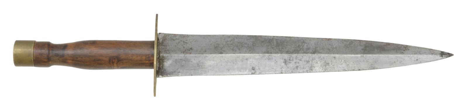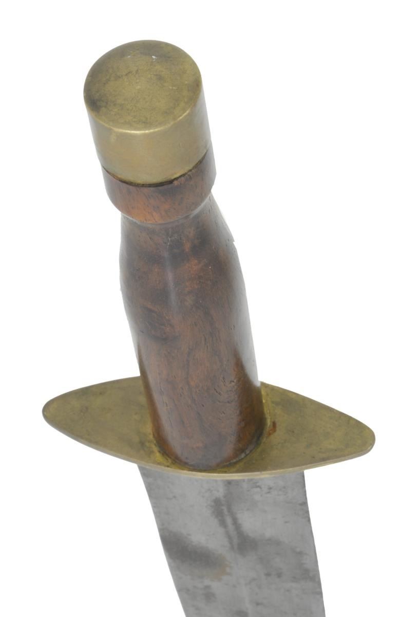 18” overall, 12.25” hollow ground, medial ridge double edge blade, 2” wide at ricasso, 3.5” oval cross guard, brass pommel cap, turned cylindrical wood grip. CONDITION: fine overall, stained gray/bright blade, light mustard patina, hand worn patina to grip. (02-18192/JS). $1,500-2,000.